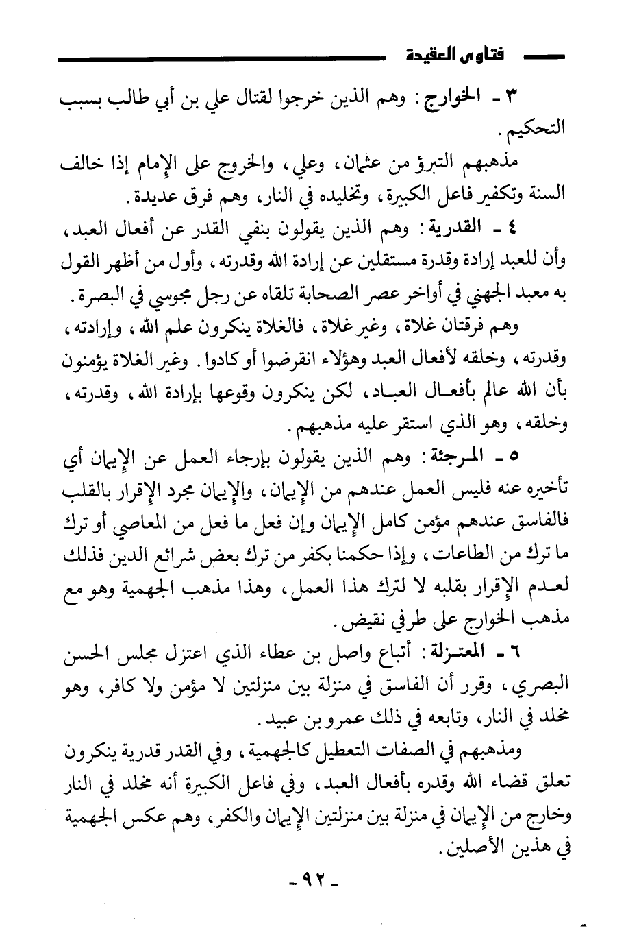 6 - المعتزلة: أتباع واصل بن عطاء الذي اعتزل مجلس الحسن البصري، وقرر أن الفاسق في منزلة بين منزلتين لا مؤمن ولا كافر، وهو مخلد في النار، وتابعه في ذلك عمرو بن عبيد.
