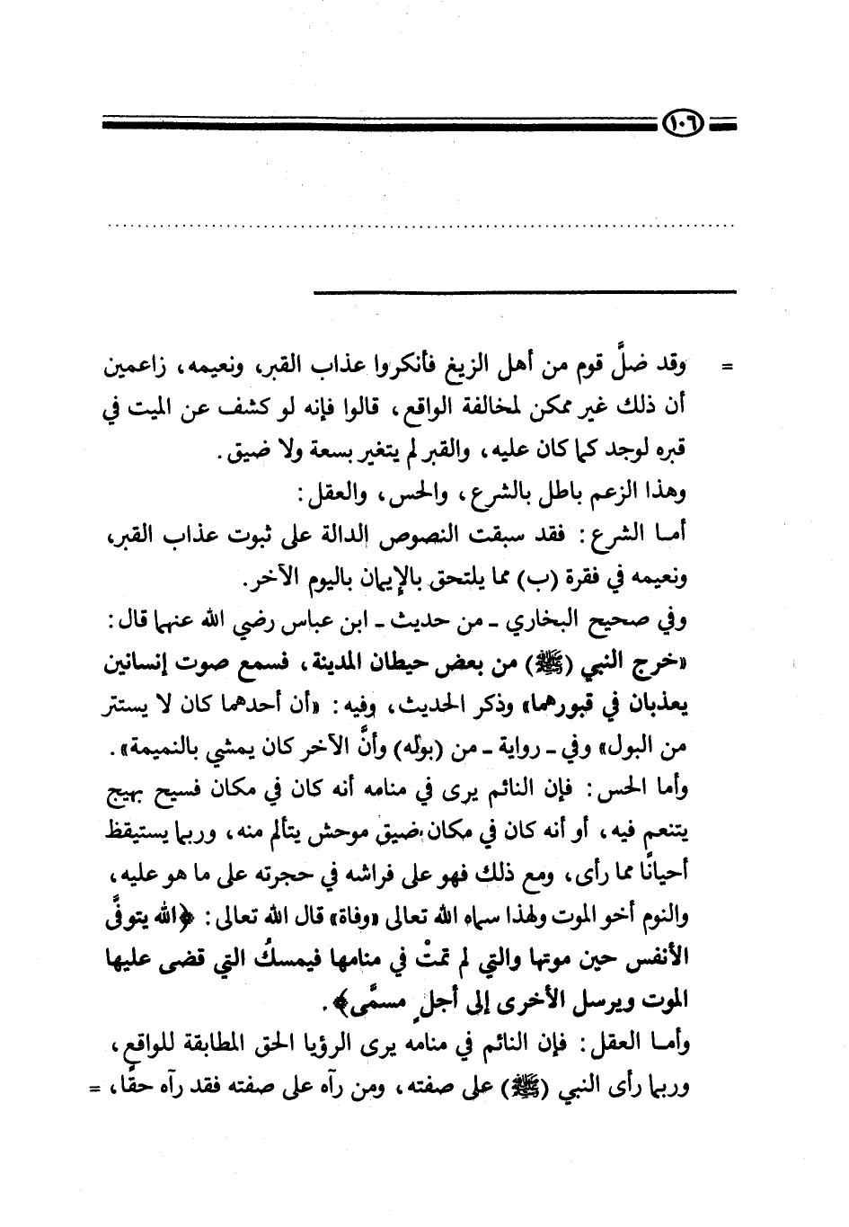وأما الحس: فإن النائم يرى في منامه أنه كان في مكان فسيح بهيج يتنعم فيه، أو أنه كان في مكان ضيق موحش يتألم منه، وربما يستيقظ أحيانا مما رأى، ومع ذلك فهو على فراشه في حجرته على ما هو عليه، والنوم أخو الموت ولهذا سماه الله تعالى " وفاة " قال الله تعالى: {اللَّهُ يَتَوَفَّى الْأَنْفُسَ حِينَ مَوْتِهَا وَالَّتِي لَمْ تَمُتْ فِي مَنَامِهَا فَيُمْسِكُ الَّتِي قَضَى عَلَيْهَا الْمَوْتَ وَيُرْسِلُ الْأُخْرَى إِلَى أَجَلٍ مُسَمًّى} .