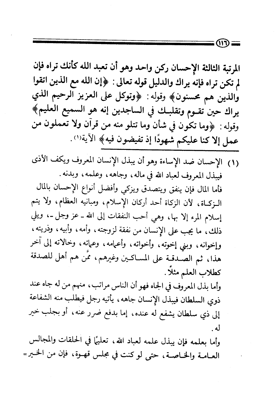 المرتبة الثالثة: الإحسان، ركن واحد وهو " أن تعبد الله كأنك تراه فإن لم تكن تراه فإنه يراك" والدليل قوله تعالى: {إِنَّ اللَّهَ مَعَ الَّذِينَ اتَّقَوْا وَالَّذِينَ هُمْ مُحْسِنُونَ} ، وقوله: {وَتَوَكَّلْ عَلَى الْعَزِيزِ الرَّحِيمِ الَّذِي يَرَاكَ حِينَ تَقُومُ وَتَقَلُّبَكَ فِي السَّاجِدِينَ إِنَّهُ هُوَ السَّمِيعُ الْعَلِيمُ} وقوله: {وَمَا تَكُونُ فِي شَأْنٍ وَمَا تَتْلُو مِنْهُ مِنْ قُرْآنٍ وَلَا تَعْمَلُونَ مِنْ عَمَلٍ إِلَّا كُنَّا عَلَيْكُمْ شُهُودًا إِذْ تُفِيضُونَ فِيهِ} الآية.