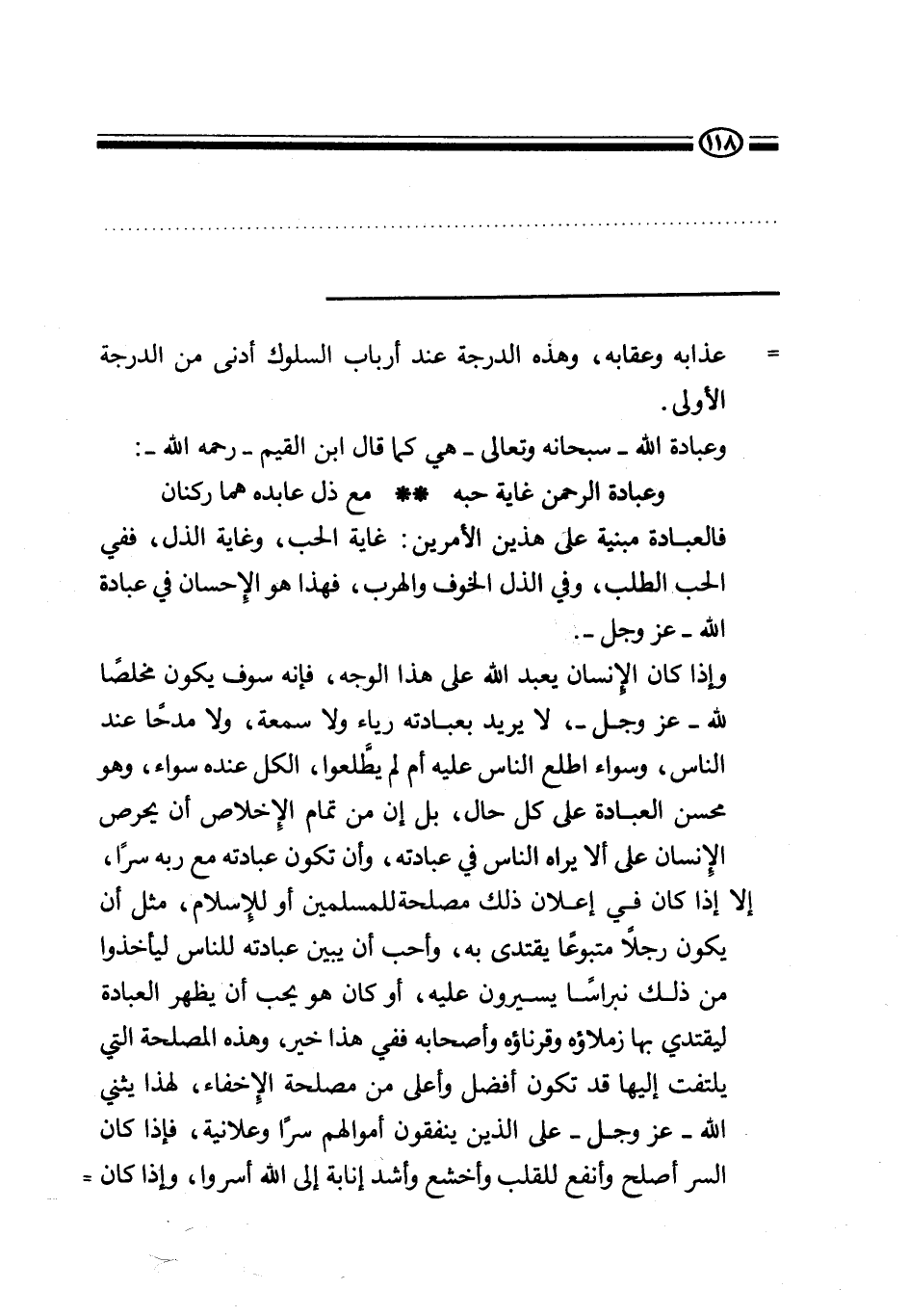 ، فالعبادة مبنية على هذين الأمرين: غاية الحب، وغاية الذل، ففي الحب الطلب، وفي الذل الخوف والهرب، فهذا هو الإحسان في عبادة الله عز وجل وإذا كان الإنسان يعبد الله على هذا الوجه، فإنه سوف يكون مخلصا لله عز وجل لا يريد بعبادته رياء ولا سمعة، ولا مدحا عند الناس، وسواء اطلع الناس عليه أم لم يطلعوا، الكل عنده سواء، وهو محسن العبادة على كل حال، بل إن من تمام الإخلاص أن يحرص الإنسان على ألا يراه الناس في عبادته، وأن تكون عبادته مع ربه سرا، إلا إذا كان في إعلان ذلك مصلحة للمسلمين أو للإسلام، مثل أن يكون رجلا متبوعا يقتدى به، وأحب أن يبين عبادته للناس ليأخذوا من ذلك نبراسا يسيرون عليه، أو كان هو يحب أن يظهر العبادة ليقتدى بها زملاؤه وقرناؤه وأصحابه ففي هذا خير، وهذه المصلحة التي يلتفت إليها قد تكون أفضل وأعلى من مصلحة الإخفاء، لهذا يثني الله عز وجل على الذين ينفقون أموالهم سرّا وعلانية، فإذا كان السر أصلح وأنفع للقلب وأخشع وأشد إنابة إلى الله أسروا، وإذا كان