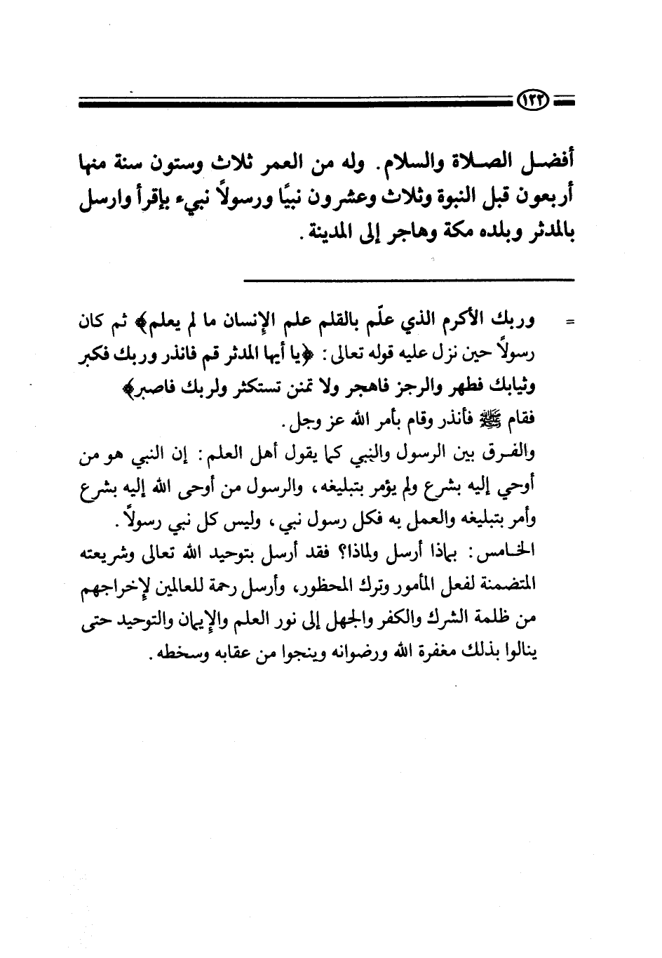 {الَّذِي عَلَّمَ بِالْقَلَمِ عَلَّمَ الْإِنْسَانَ مَا لَمْ يَعْلَمْ} ، ثم كان رسولا حين نزل عليه قوله تعالى: {يَا أَيُّهَا الْمُدَّثِّرُ قُمْ فَأَنْذِرْ وَرَبَّكَ فَكَبِّرْ وَثِيَابَكَ فَطَهِّرْ وَالرُّجْزَ فَاهْجُرْ وَلَا تَمْنُنْ تَسْتَكْثِرُ وَلِرَبِّكَ فَاصْبِرْ} ، فقام صَلَّى اللَّهُ عَلَيْهِ وَسَلَّمَ فأنذر وقام بأمر الله عز وجل.