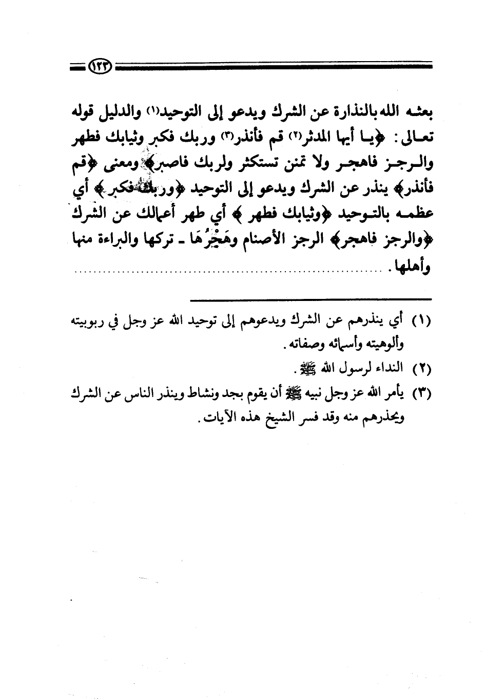 (3) يأمر الله عز وجل نبيه صَلَّى اللَّهُ عَلَيْهِ وَسَلَّمَ أن يقوم بجد ونشاط، وينذر الناس عن الشرك ويحذرهم منه، وقد فسر الشيخ هذه الآيات.
