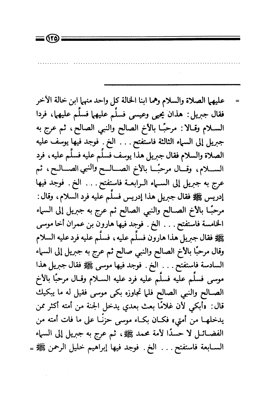 عليهما الصلاة والسلام وهما ابنا الخالة كل واحد منهما ابن خالة الآخر فقال جبريل: هذان يحيى وعيسى فسلم عليهما، فسلم عليهما فردا السلام وقالا: مرحبا بالأخ الصالح والنبي الصالح، ثم عرج به جبريل إلى السماء الثالثة فاستفتح. . . إلخ. فوجد فيها يوسف عليه الصلاة والسلام فقال جبريل: هذا يوسف فسلم عليه فسلم عليه، فرد السلام، وقال: مرحبا بالأخ الصالح والنبي الصالح، ثم عرج به جبريل إلى السماء الرابعة فاستفتح. . إلخ فوجد فيها إدريس صَلَّى اللَّهُ عَلَيْهِ وَسَلَّمَ فقال جبريل: هذا إدريس فسلم عليه فسلم عليه فرد السلام، وقال: مرحبا بالأخ الصالح والنبي الصالح ثم عرج به جبريل إلى السماء الخامسة فاستفتح. . . .إلخ. فوجد فيها هارون بن عمران أخا موسى صَلَّى اللَّهُ عَلَيْهِ وَسَلَّمَ فقال جبريل: هذا هارون فسلم عليه، فسلم عليه فرد عليه السلام وقال: مرحبا بالأخ الصالح، والنبي الصالح ثم عرج به جبريل إلى السماء السادسة فاستفتح. . . . إلخ. فوجد فيها موسى صَلَّى اللَّهُ عَلَيْهِ وَسَلَّمَ فقال جبريل: هذا موسى فسلم عليه، فسلم عليه فرد عليه السلام وقال: مرحبا بالأخ الصالح والنبي الصالح فلما تجاوزه بكى موسى فقيل له: ما يبكيك قال: "أبكي لأن غلاما بعث بعدي يدخل الجنة من أمته أكثر ممن يدخلها من أمتي" فكان بكاء موسى حزنا على ما فات أمته من الفضائل لا حسدا لأمة محمد صَلَّى اللَّهُ عَلَيْهِ وَسَلَّمَ، ثم عرج به جبريل إلى السماء السابعة فاستفتح ... إلخ. فوجد فيها إبراهيم خليل الرحمن صَلَّى اللَّهُ عَلَيْهِ وَسَلَّمَ