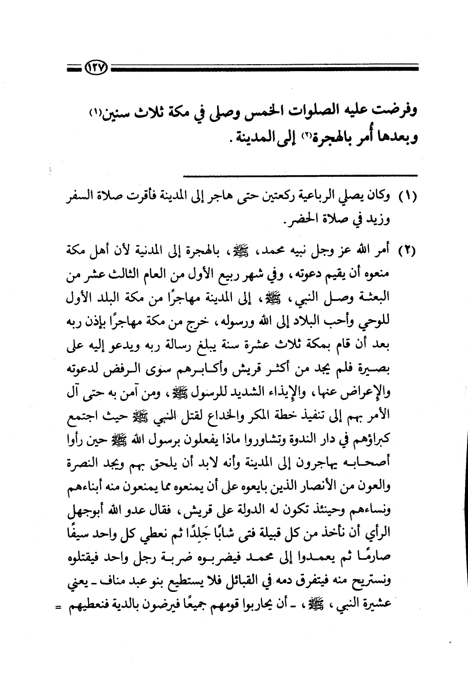 (1) وكان يصلي الرباعية ركعتين حتى هاجر إلى المدينة فأقرت صلاة السفر وزيد في صلاة الحضر.