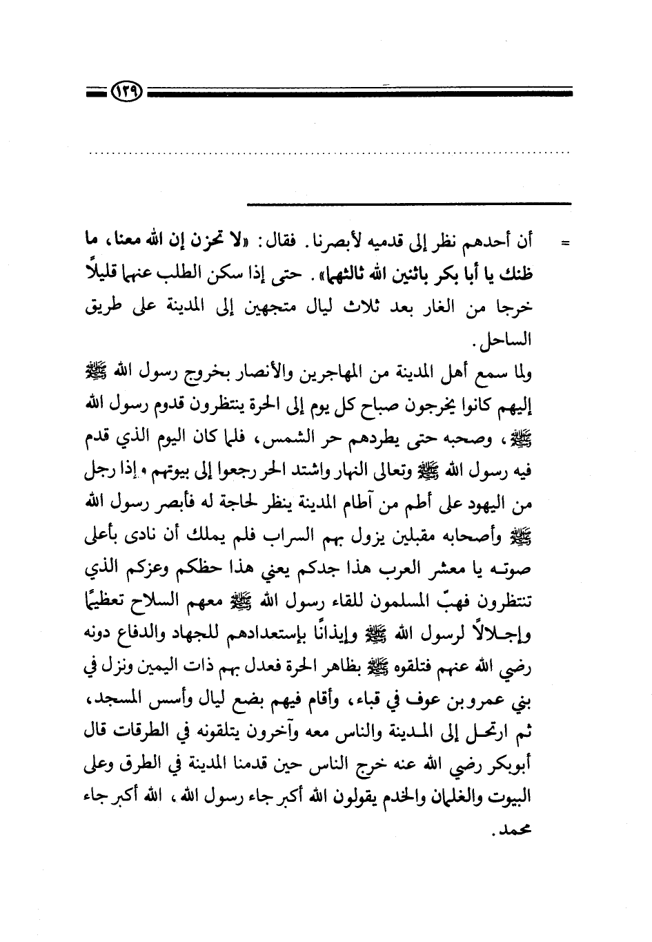 أن أحدهم نظر إلى قدميه لأبصرنا. فقال: «" لا تحزن إن الله معنا، ما ظنك يا أبا بكر باثنين الله ثالثهما» . حتى إذا سكن الطلب عنهما قليلا خرجا من الغار بعد ثلاث ليال متجهين إلى المدينة على طريق الساحل.