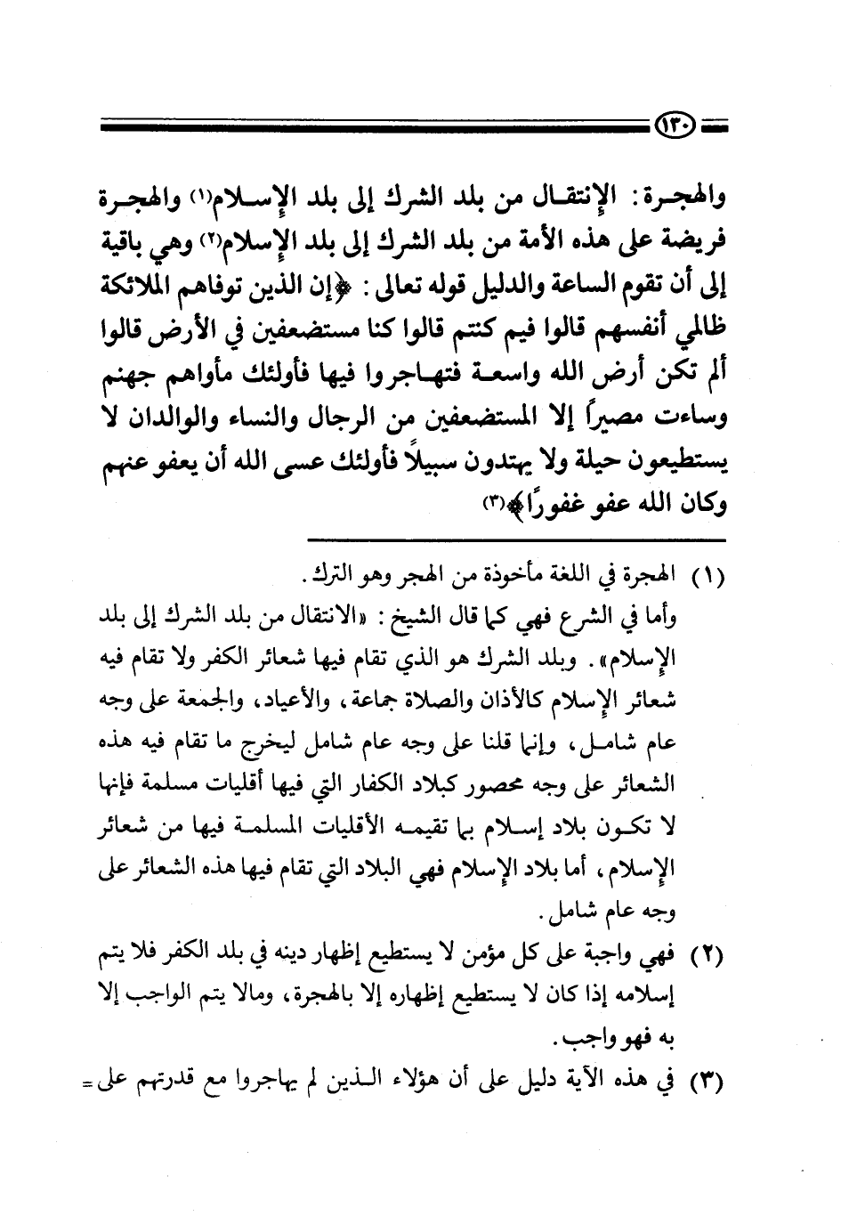 والهجرة: الانتقال من بلد الشرك إلى بلد الإسلام (1) والهجرة فريضة على هذه الأمة من بلد الشرك إلى بلد الإسلام (2) ، وهي باقية إلى أن تقوم الساعة. والدليل قوله تعالى: {إِنَّ الَّذِينَ تَوَفَّاهُمُ الْمَلَائِكَةُ ظَالِمِي أَنْفُسِهِمْ قَالُوا فِيمَ كُنْتُمْ قَالُوا كُنَّا مُسْتَضْعَفِينَ فِي الْأَرْضِ قَالُوا أَلَمْ تَكُنْ أَرْضُ اللَّهِ وَاسِعَةً فَتُهَاجِرُوا فِيهَا فَأُولَئِكَ مَأْوَاهُمْ جَهَنَّمُ وَسَاءَتْ مَصِيرًا إِلَّا الْمُسْتَضْعَفِينَ مِنَ الرِّجَالِ وَالنِّسَاءِ وَالْوِلْدَانِ لَا يَسْتَطِيعُونَ حِيلَةً وَلَا يَهْتَدُونَ سَبِيلًا فَأُولَئِكَ عَسَى اللَّهُ أَنْ يَعْفُوَ عَنْهُمْ وَكَانَ اللَّهُ عَفُوًّا غَفُورًا} (3) .