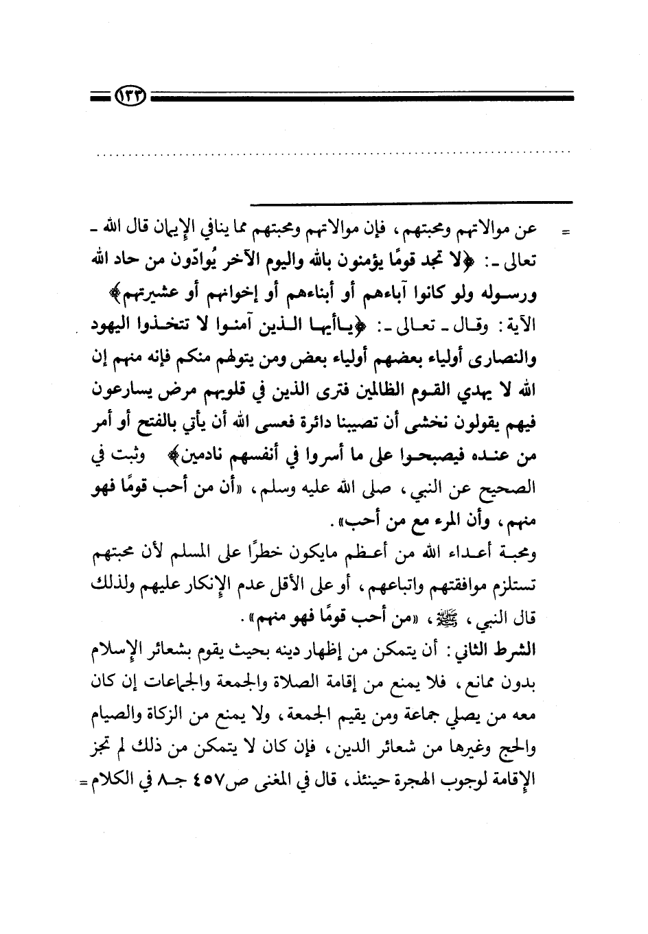 الشرط الثاني: أن يتمكن من إظهار دينه بحيث يقوم بشعائر الإسلام بدون ممانع، فلا يمنع من إقامة الصلاة والجمعة والجماعات إن كان معه من يصلي جماعة ومن يقيم الجمعة، ولا يمنع من الزكاة والصيام والحج وغيرها من شعائر الدين، فإن كان لا يتمكن من ذلك لم تجز الإقامة لوجوب الهجرة حينئذ، قال في المغني ص 457 جـ 8 في الكلام