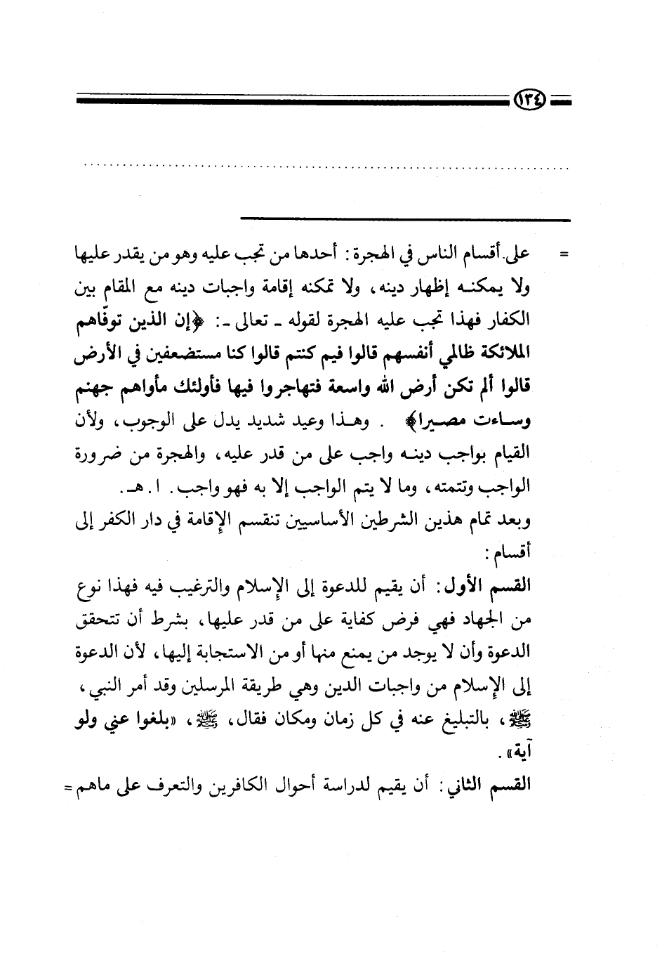 على أقسام الناس في الهجرة: أحدها من تجب عليه وهو من يقدر عليها ولا يمكنه إظهار دينه، ولا تمكنه إقامة واجبات دينه مع المقام بين الكفار فهذا تجب عليه الهجرة لقوله تعالى: {إِنَّ الَّذِينَ تَوَفَّاهُمُ الْمَلَائِكَةُ ظَالِمِي أَنْفُسِهِمْ قَالُوا فِيمَ كُنْتُمْ قَالُوا كُنَّا مُسْتَضْعَفِينَ فِي الْأَرْضِ قَالُوا أَلَمْ تَكُنْ أَرْضُ اللَّهِ وَاسِعَةً فَتُهَاجِرُوا فِيهَا فَأُولَئِكَ مَأْوَاهُمْ جَهَنَّمُ وَسَاءَتْ مَصِيرًا} . وهذا وعيد شديد يدل على الوجوب، ولأن القيام بواجب دينه واجب على من قدر عليه، والهجرة من ضرورة الواجب وتتمته، وما لا يتم الواجب إلا به فهو واجب. اهـ.