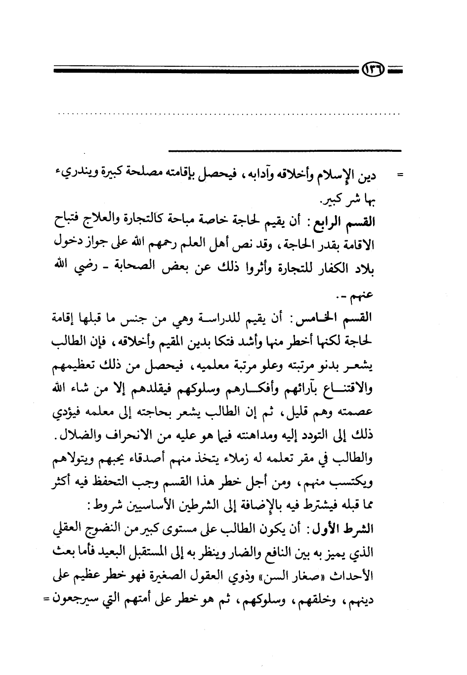 القسم الخامس: أن يقيم للدراسة وهي من جنس ما قبلها إقامة لحاجة لكنها أخطر منها وأشد فتكا بدين المقيم وأخلاقه، فإن الطالب يشعر بدنو مرتبته وعلو مرتبة معلميه، فيحصل من ذلك تعظيمهم والاقتناع بآرائهم وأفكارهم وسلوكهم فيقلدهم إلا من شاء الله عصمته وهم قليل، ثم إن الطالب يشعر بحاجته إلى معلمه فيؤدي ذلك إلى التودد إليه ومداهنته فيما هو عليه من الانحراف والضلال. والطالب في مقر تعلمه له زملاء يتخذ منهم أصدقاء يحبهم ويتولاهم ويكتسب منهم، ومن أجل خطر هذا القسم وجب التحفظ فيه أكثر مما قبله فيشترط فيه بالإضافة إلى الشرطين الأساسيين شروط: