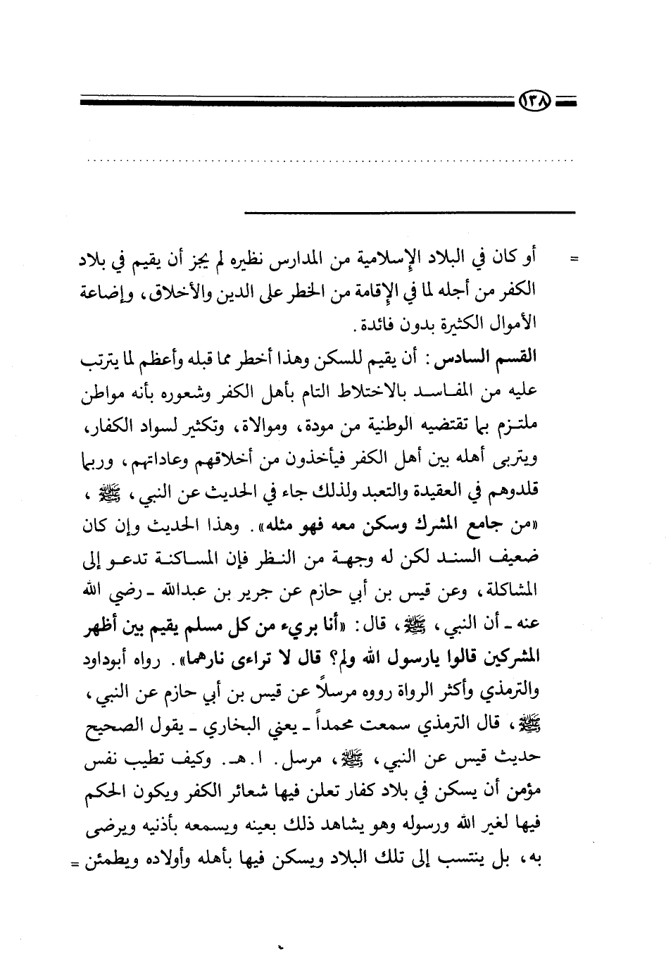 القسم السادس: أن يقيم للسكن وهذا أخطر مما قبله وأعظم لما يترتب عليه من المفاسد بالاختلاط التام بأهل الكفر وشعوره بأنه مواطن ملتزم بما تقتضيه الوطنية من مودة، وموالاة، وتكثير لسواد الكفار، ويتربى أهله بين أهل الكفر فيأخذون من أخلاقهم وعاداتهم، وربما قلدوهم في العقيدة والتعبد، ولذلك جاء في الحديث عن النبي - صَلَّى اللَّهُ عَلَيْهِ وَسَلَّمَ-: «"من جامع المشرك وسكن معه فهو مثله» . وهذا الحديث وإن كان ضعيف السند لكن له وجهة من النظر فإن المساكنة تدعو إلى المشاكلة، وعن قيس بن أبي حازم عن جرير بن عبد الله رضي الله عنه أن النبي - صَلَّى اللَّهُ عَلَيْهِ وَسَلَّمَ - قال: «"أنا بريء من كل مسلم يقيم بين أظهر المشركين، قالوا: يا رسول الله ولم؟ قال: لا تراءى نارهما» . رواه أبو داود والترمذي: وأكثر الرواة رووه مرسلا عن قيس بن أبي حازم عن النبي - صَلَّى اللَّهُ عَلَيْهِ وَسَلَّمَ -.