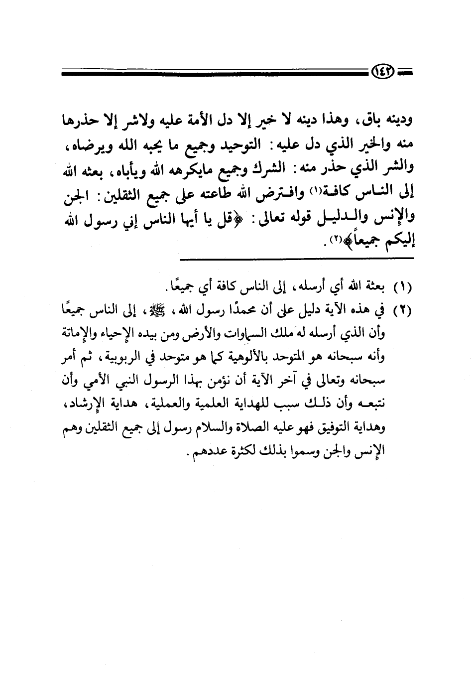 ودينه باق، وهذا دينه، لا خير إلا دل الأمة عليه، ولا شر إلا حذرها منه، والخير الذي دل عليه: التوحيد، وجميع ما يحبه الله ويرضاه، والشر الذي حذر منه: الشرك وجميع ما يكرهه الله ويأباه. بعثه الله إلى الناس كافة (1) ، وافترض الله طاعته على جميع الثقلين: الجن والإِنس، والدليل قوله تعالى: {قُلْ يَا أَيُّهَا النَّاسُ إِنِّي رَسُولُ اللَّهِ إِلَيْكُمْ جَمِيعًا} (2) .