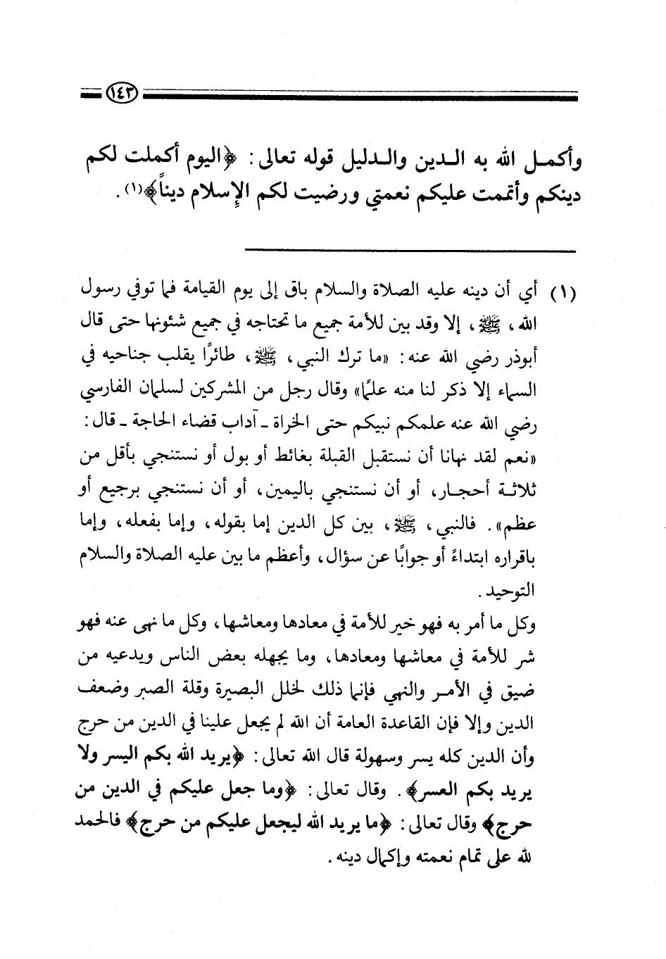 (1) أي أن دينه - عليه الصلاة والسلام - باق إلى يوم القيامة فما توفي رسول الله - صَلَّى اللَّهُ عَلَيْهِ وَسَلَّمَ - إلا وقد بين للأمة جميع ما تحتاجه في جميع شؤونها حتى قال أبو ذر - رضي الله عنه -: «ما ترك النبي صلى - الله عليه وسلم - طائرا يقلب جناحيه في السماء إلا ذكر لنا منه علما» ، «وقال رجل من المشركين لسلمان الفارسي - رضي الله عنه -: علمكم نبيكم حتى الخراءة -آداب قضاء الحاجة- قال: " نعم، لقد نهانا أن نستقبل القبلة بغائط أو بول أو نستنجي بأقل من ثلاثة أحجار، أو أن نستنجي باليمين، أو أن نستنجي برجيع أو عظم» فالنبي - صَلَّى اللَّهُ عَلَيْهِ وَسَلَّمَ، بين كل الدين إما بقوله، وإما بفعله، وإما بإقراره ابتداء أو جوابا عن سؤال، وأعظم ما بين - عليه الصلاة والسلام - التوحيد.