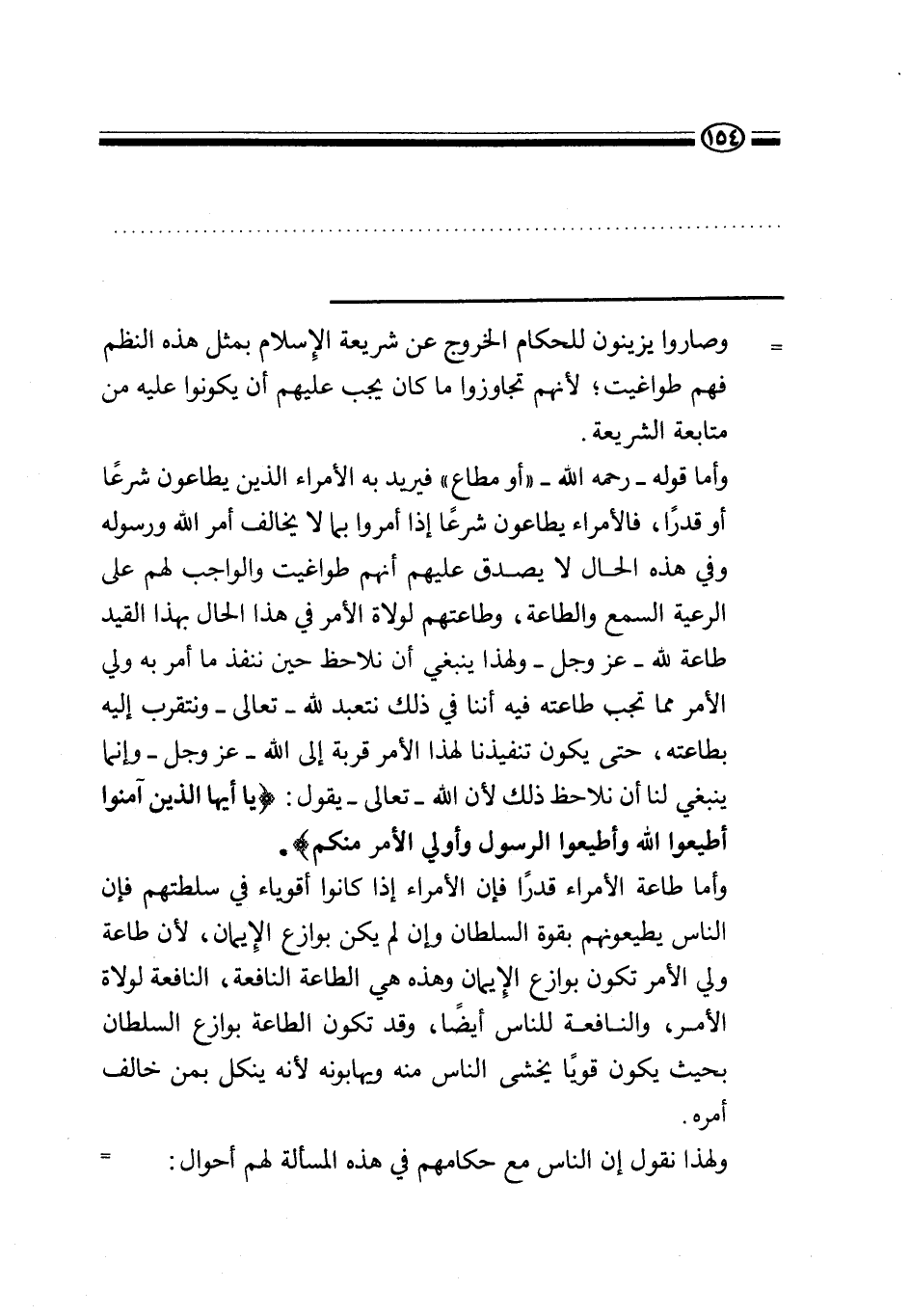 وأما قوله رحمه الله: "أو مطاع " فيريد به الأمراء الذين يطاعون شرعا أو قدرا، فالأمراء يطاعون شرعا إذا أمروا بما لا يخالف أمر الله ورسوله، وفي هذه الحال لا يصدق عليهم أنهم طواغيت، والواجب لهم على الرعية السمع والطاعة، وطاعتهم لولاة الأمر في هذا الحال بهذا القيد طاعة لله عز وجل ولهذا ينبغي أن نلاحظ حين ننفذ ما أمر به ولي الأمر مما تجب طاعته فيه أننا في ذلك نتعبد لله تعالى ونتقرب إليه بطاعته، حتى يكون تنفيذنا لهذا الأمر قربة إلى الله - عز وجل - وإنما ينبغي لنا أن نلاحظ ذلك لأن الله تعالى يقول: {يَا أَيُّهَا الَّذِينَ آمَنُوا أَطِيعُوا اللَّهَ وَأَطِيعُوا الرَّسُولَ وَأُولِي الْأَمْرِ مِنْكُمْ} .