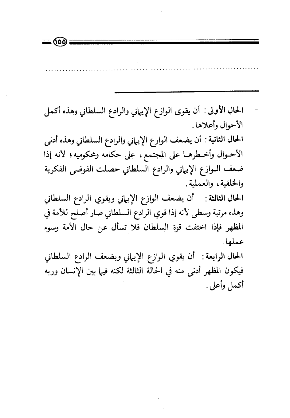 الحال الثالثة: أن يضعف الوازع الإيماني ويقوى الرادع السلطاني وهذه مرتبة وسطى لأنه إذا قوي الرادع السلطاني صار أصلح للأمة في المظهر فإذا اختفت قوة السلطان فلا تسأل عن حال الأمة وسوء عملها.