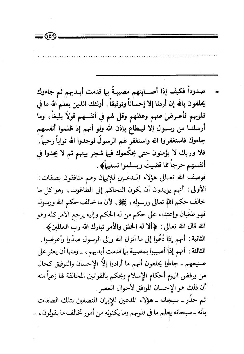 {فَكَيْفَ إِذَا أَصَابَتْهُمْ مُصِيبَةٌ بِمَا قَدَّمَتْ أَيْدِيهِمْ ثُمَّ جَاءُوكَ يَحْلِفُونَ بِاللَّهِ إِنْ أَرَدْنَا إِلَّا إِحْسَانًا وَتَوْفِيقًا أُولَئِكَ الَّذِينَ يَعْلَمُ اللَّهُ مَا فِي قُلُوبِهِمْ فَأَعْرِضْ عَنْهُمْ وَعِظْهُمْ وَقُلْ لَهُمْ فِي أَنْفُسِهِمْ قَوْلًا بَلِيغًا وَمَا أَرْسَلْنَا مِنْ رَسُولٍ إِلَّا لِيُطَاعَ بِإِذْنِ اللَّهِ وَلَوْ أَنَّهُمْ إِذْ ظَلَمُوا أَنْفُسَهُمْ جَاءُوكَ فَاسْتَغْفَرُوا اللَّهَ وَاسْتَغْفَرَ لَهُمُ الرَّسُولُ لَوَجَدُوا اللَّهَ تَوَّابًا رَحِيمًا فَلَا وَرَبِّكَ لَا يُؤْمِنُونَ حَتَّى يُحَكِّمُوكَ فِيمَا شَجَرَ بَيْنَهُمْ ثُمَّ لَا يَجِدُوا فِي أَنْفُسِهِمْ حَرَجًا مِمَّا قَضَيْتَ وَيُسَلِّمُوا تَسْلِيمًا} .
