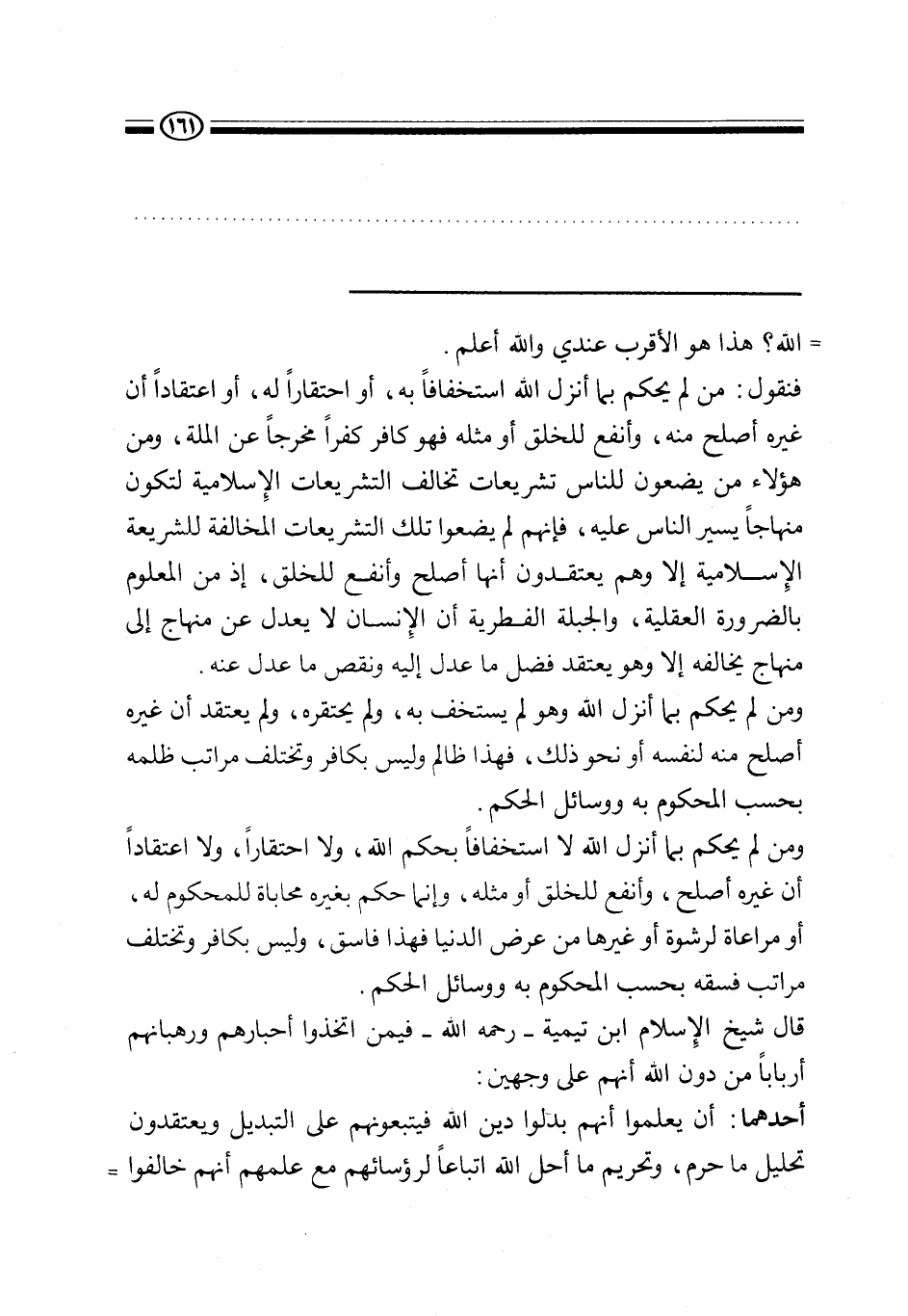 ومن لم يحكم بما أنزل الله وهو لم يستخف به، ولم يحتقره، ولم يعتقد أن غيره أصلح منه لنفسه أو نحو ذلك، فهذا ظالم وليس بكافر وتختلف مراتب ظلمه بحسب المحكوم به ووسائل الحكم.