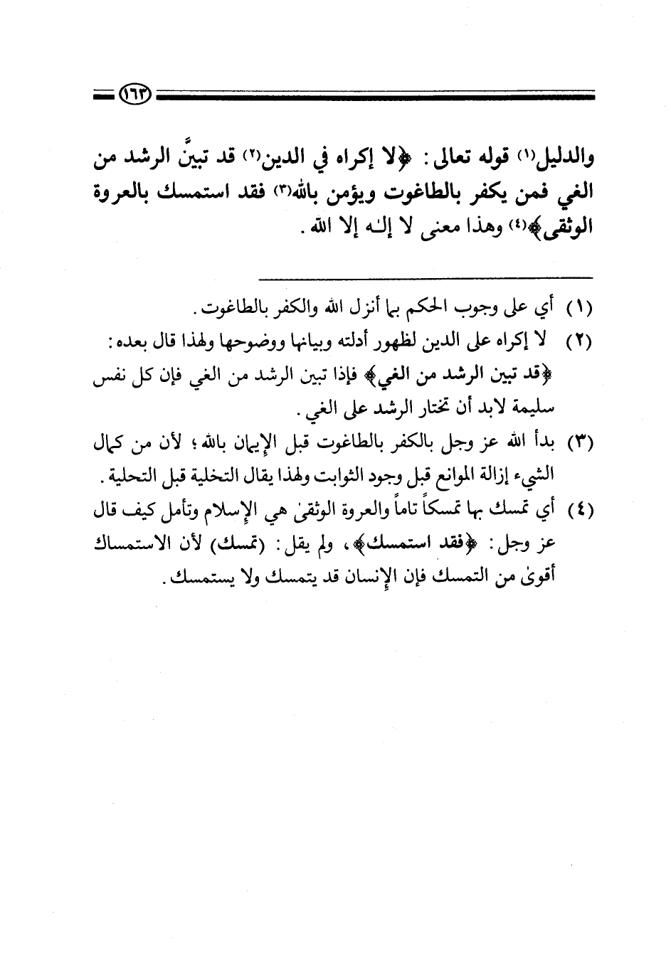 والدليل (1) قوله تعالى: {لَا إِكْرَاهَ فِي الدِّينِ} (2) {قَدْ تَبَيَّنَ الرُّشْدُ مِنَ الْغَيِّ فَمَنْ يَكْفُرْ بِالطَّاغُوتِ وَيُؤْمِنْ بِاللَّهِ} (1) {فَقَدِ اسْتَمْسَكَ بِالْعُرْوَةِ الْوُثْقَى} (2) وهذا معنى لا إله إلا الله.