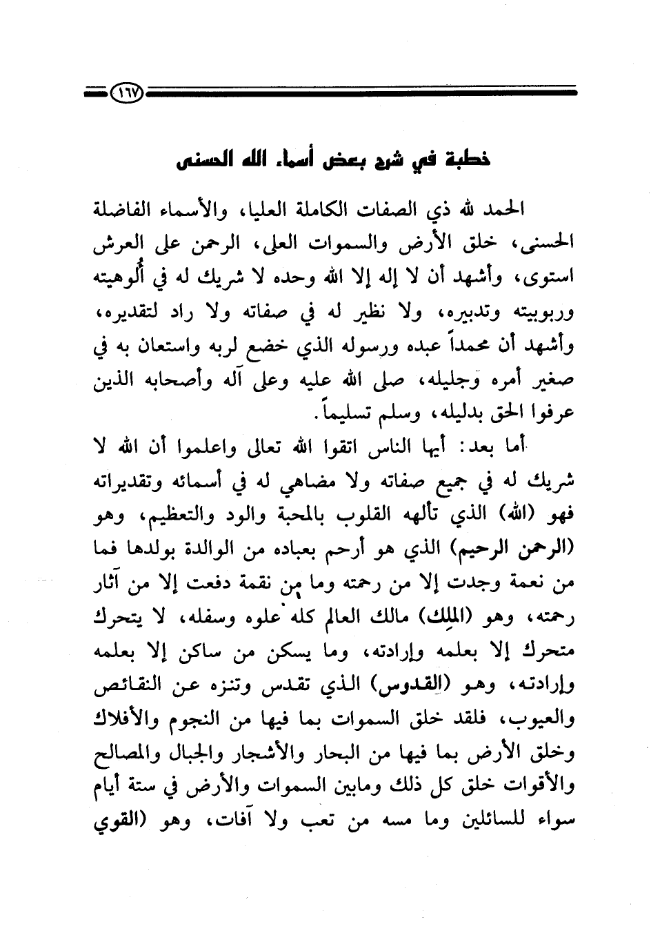 أما بعد: أيها الناس اتقوا الله تعالى واعلموا أن الله لا شريك له في جميع صفاته ولا مضاهي له في أسمائه وتقديراته فهو (الله) الذي تألهه القلوب بالمحبة والود والتعظيم، وهو (الرحمن الرحيم) الذي هو أرحم بعباده من الوالدة بولدها فما من نعمة وجدت إلا من رحمته وما من نقمة دفعت إلا من آثار رحمته، وهو (الملك) مالك العالم كله علوه وسفله، لا يتحرك متحرك إلا بعلمه وإرادته وما يسكن من ساكن إلا بعلمه وإرادته. وهو (القدوس) الذي تقدس وتنزه عن النقائص والعيوب، فلقد خلق السماوات بما فيها من النجوم والأفلاك وخلق الأرض بما فيها من البحار والأشجار والجبال والمصالح والأقوات خلق كل ذلك وما بين السماوات والأرض في ستة أيام سواء للسائلين وما مسه من تعب ولا آفات، وهو (القوي