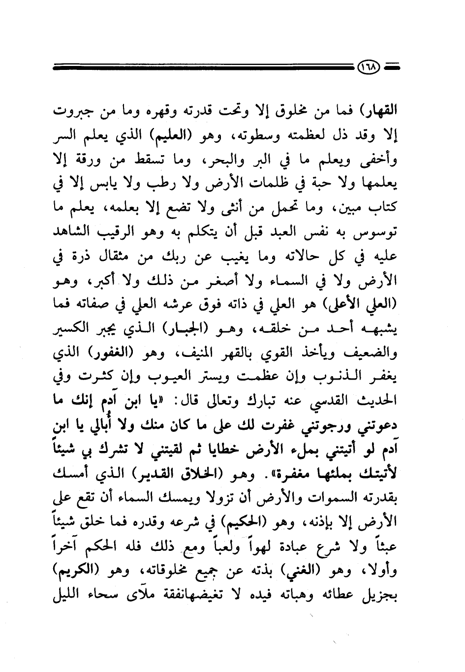 وفي الحديث القدسي عنه تبارك وتعالى قال: «"يا ابن آدم إنك ما دعوتني ورجوتني غفرت لك على ما كان منك ولا أبالي، يا ابن آدم لو أتيتني بملء الأرض خطايا ثم لقيتني لا تشرك بي شيئا لأتيتك بملئها مغفرة ".» وهو (الخلاق القدير) الذي أمسك بقدرته السماوات والأرض أن تزولا ويمسك السماء أن تقع على الأرض إلا بإذنه، وهو (الحكيم) في شرعه وقدره فما خلق شيئا عبثا ولا شرع عبادة لهوا ولعبا ومع ذلك فله الحكم آخرا وأولا، وهو (الغني) بذاته عن جميع مخلوقاته، وهو (الكريم) بجزيل عطائه وهباته، فيده لا تغيضها نفقة ملآى سحاء الليل