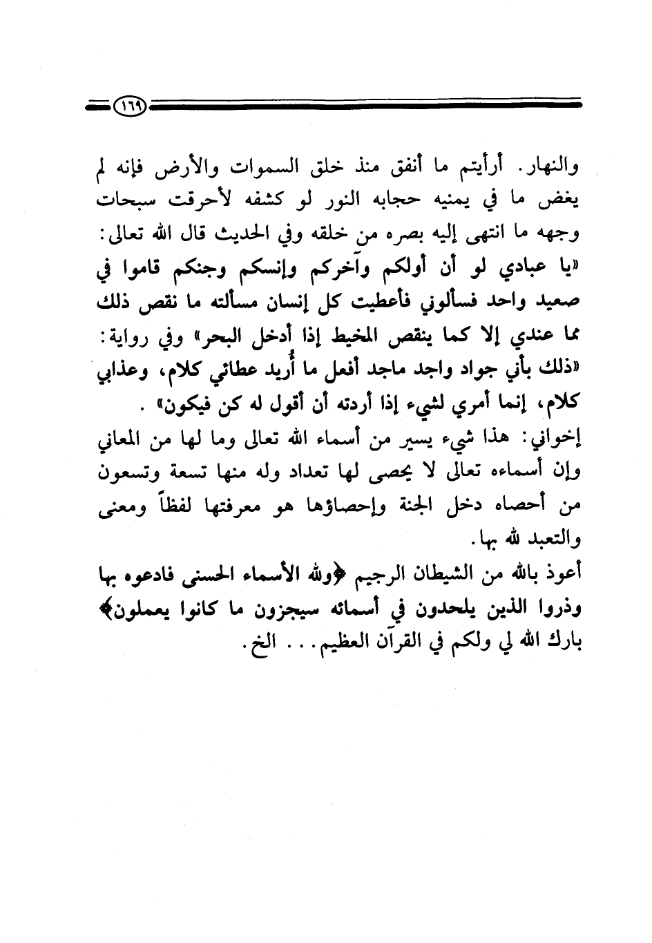 والنهار. أرأيتم ما أنفق منذ خلق السماوات والأرض فإنه لم يغض ما في يمينه حجابه النور لو كشفه لأحرقت سبحات وجهه ما انتهى إليه بصره من خلقه. وفي الحديث قال الله تعالى: «يا عبادي لو أن أولكم وآخركم وإنسكم وجنكم قاموا في صعيد واحد فسألوني فأعطيت كل إنسان مسألته ما نقص ذلك مما عندي إلا كما ينقص المخيط إذا أدخل البحر» ، وفي رواية: «ذلك بأني جواد واجد ماجد أفعل ما أريد عطائي كلام، وعذابي كلام، إنما أمري لشيء إذا أردته أن أقول له: كن فيكون» .