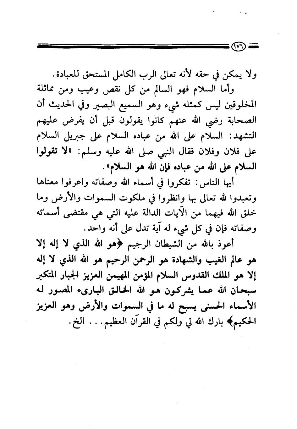 وأما السلام فهو السالم من كل نقص وعيب ومن مماثلة المخلوقين، ليس كمثله شيء وهو السميع البصير. وفي الحديث أن الصحابة - رضي الله عنهم - كانوا يقولون قبل أن يفرض عليهم التشهد: السلام على الله من عباده، السلام على جبريل، السلام على فلان وفلان، فقال النبي - صَلَّى اللَّهُ عَلَيْهِ وَسَلَّمَ -: «لا تقولوا: السلام على الله من عباده فإن الله هو السلام» .