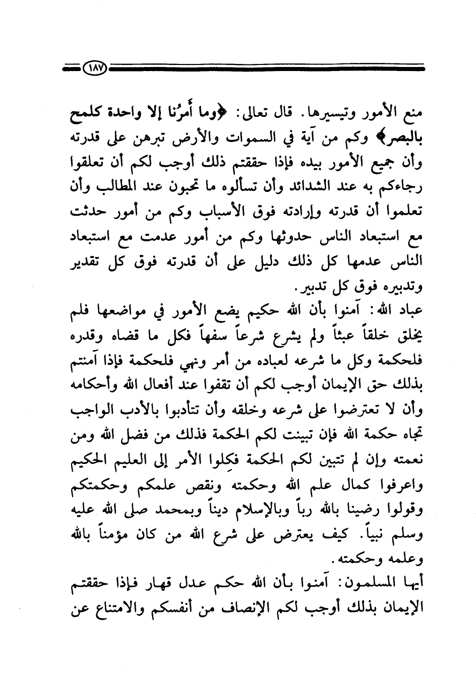 منع الأمور وتيسيرها. قال تعالى: {وَمَا أَمْرُنَا إِلَّا وَاحِدَةٌ كَلَمْحٍ بِالْبَصَرِ} ، وكم من آية في السماوات والأرض تبرهن على قدرته، وأن جميع الأمور بيده فإذا حققتم ذلك أوجب لكم أن تعلقوا رجاءكم به عند الشدائد وأن تسألوه ما تحبون عند المطالب وأن تعلموا أن قدرته وإرادته فوق الأسباب، وكم من أمور حدثت مع استبعاد الناس حدوثها، وكم من أمور عدمت مع استبعاد الناس عدمها كل ذلك دليل على أن قدرته فوق كل تقدير وتدبيره فوق كل تدبير.