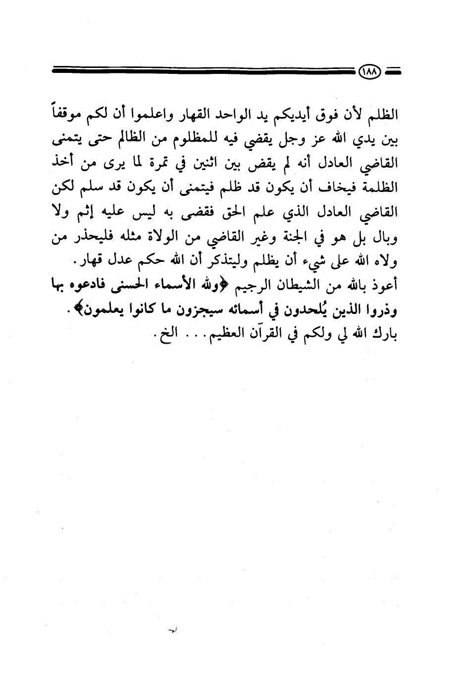 الظلم لأن فوق أيديكم يد الواحد القهار، واعلموا أن لكم موقفا بين يدي الله عز وجل يقضي فيه للمظلوم من الظالم حتى يتمنى القاضي العادل أنه لم يقض بين اثنين في تمرة لما يرى من أخذ الظلمة فيخاف أن يكون قد ظلم فيتمنى أن يكون قد سلم، لكن القاضي العادل الذي علم الحق فقضى به ليس عليه إثم ولا وبال بل هو في الجنة وغير القاضي من الولاة مثله، فليحذر من ولاه الله على شيء أن يظلم وليتذكر أن الله حكم عدل قهار.