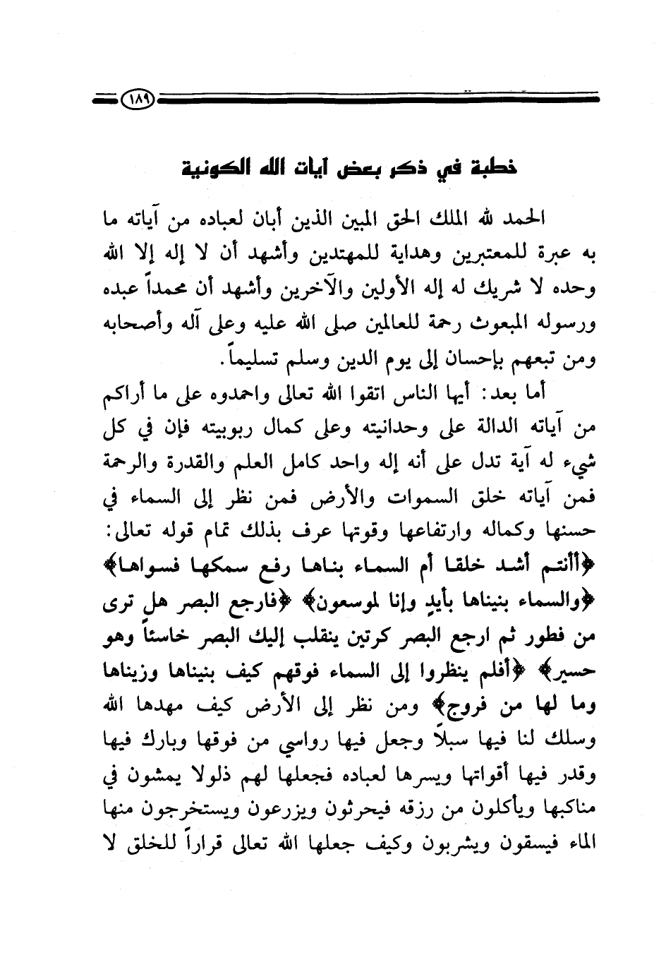 أما بعد: أيها الناس اتقوا الله تعالى واحمدوه على ما أراكم من آياته الدالة على وحدانيته وعلى كمال ربوبيته فإن في كل شيء له آية تدل على أنه إله واحد كامل العلم والقدرة والرحمة، فمن آياته خلق السماوات والأرض فمن نظر إلى السماء في حسنها وكمالها وارتفاعها وقوتها عرف بذلك تمام قوله تعالى: {أَأَنْتُمْ أَشَدُّ خَلْقًا أَمِ السَّمَاءُ بَنَاهَا رَفَعَ سَمْكَهَا فَسَوَّاهَا} {وَالسَّمَاءَ بَنَيْنَاهَا بِأَيْدٍ وَإِنَّا لَمُوسِعُونَ} {فَارْجِعِ الْبَصَرَ هَلْ تَرَى مِنْ فُطُورٍ ثُمَّ ارْجِعِ الْبَصَرَ كَرَّتَيْنِ يَنْقَلِبْ إِلَيْكَ الْبَصَرُ خَاسِئًا وَهُوَ حَسِيرٌ} {أَفَلَمْ يَنْظُرُوا إِلَى السَّمَاءِ فَوْقَهُمْ كَيْفَ بَنَيْنَاهَا وَزَيَّنَّاهَا وَمَا لَهَا مِنْ فُرُوجٍ} . ومن نظر إلى الأرض كيف مهدها الله وسلك لنا فيها سبلا وجعل فيها رواسي من فوقها وبارك فيها وقدر فيها أقواتها ويسرها لعباده فجعلها لهم ذلولا يمشون في مناكبها ويأكلون من رزقه، فيحرثون ويزرعون ويستخرجون منها الماء فيسقون ويشربون، وكيف جعلها الله تعالى قرارا للخلق لا