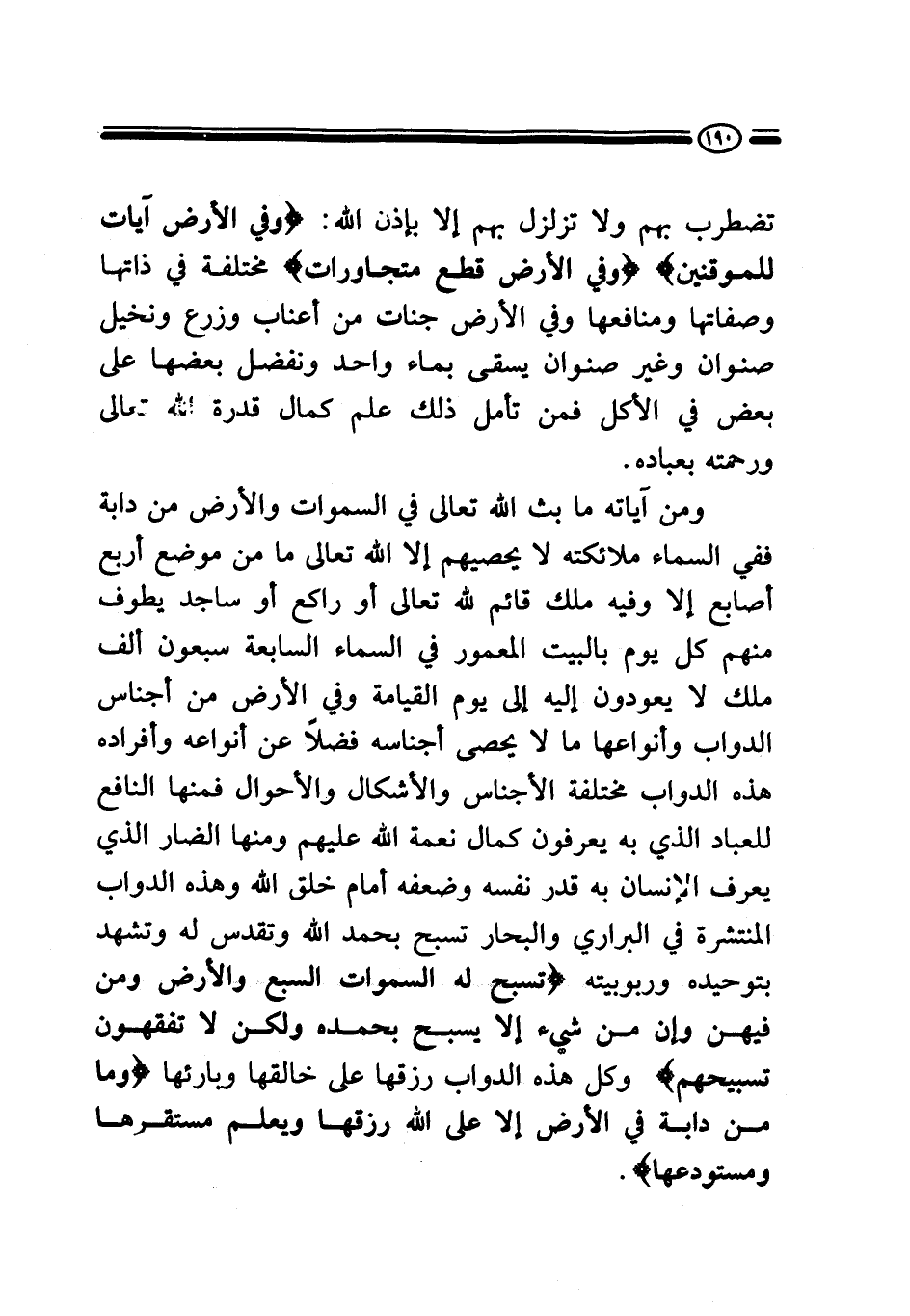 ومن آياته ما بث الله تعالى في السماوات والأرض من دابة، ففي السماء ملائكته لا يحصيهم إلا الله تعالى ما من موضع أربع أصابع إلا وفيه ملك قائم لله تعالى أو راكع أو ساجد، يطوف منهم كل يوم بالبيت المعمور في السماء السابعة سبعون ألف ملك لا يعودون إليه إلى يوم القيامة، وفي الأرض من أجناس الدواب وأنواعها ما لا يحصى أجناسه فضلا عن أنواعه وأفراده، هذه الدواب مختلفة الأجناس والأشكال والأحوال، فمنها النافع للعباد الذي به يعرفون كمال نعمة الله عليهم، ومنها الضار الذي يعرف الإنسان به قدر نفسه وضعفه أمام خلق الله، وهذه الدواب المنتشرة في البراري والبحار تسبح بحمد الله وتقدس له وتشهد بتوحيده وربوبيته {تُسَبِّحُ لَهُ السَّمَاوَاتُ السَّبْعُ وَالْأَرْضُ وَمَنْ فِيهِنَّ وَإِنْ مِنْ شَيْءٍ إِلَّا يُسَبِّحُ بِحَمْدِهِ وَلَكِنْ لَا تَفْقَهُونَ تَسْبِيحَهُمْ} وكل هذه الدواب رزقها على خالقها وبارئها {وَمَا مِنْ دَابَّةٍ فِي الْأَرْضِ إِلَّا عَلَى اللَّهِ رِزْقُهَا وَيَعْلَمُ مُسْتَقَرَّهَا وَمُسْتَوْدَعَهَا} .