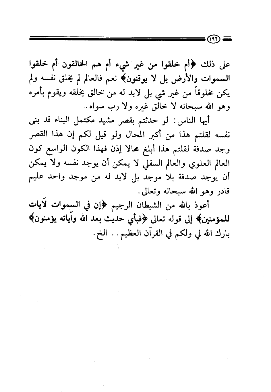 أيها الناس: لو حدثتم بقصر مشيد مكتمل البناء قد بنى نفسه لقلتم هذا من أكبر المحال، ولو قيل لكم إن هذا القصر وجد صدفة لقلتم هذا أبلغ محالا، إذن فهذا الكون الواسع كون العالم العلوي والعالم السفلي لا يمكن أن يوجد نفسه ولا يمكن أن يوجد صدفة بلا موجد، بل لا بد له من موجد واحد عليم قادر وهو الله سبحانه وتعالى.