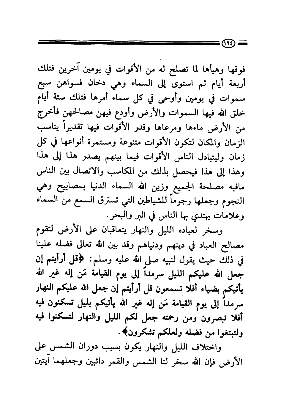 وسخر لعباده الليل والنهار يتعاقبان على الأرض لتقوم مصالح العباد في دينهم ودنياهم، وقد بين الله تعالى فضله علينا في ذلك حيث يقول لنبيه - صَلَّى اللَّهُ عَلَيْهِ وَسَلَّمَ -: {قُلْ أَرَأَيْتُمْ إِنْ جَعَلَ اللَّهُ عَلَيْكُمُ اللَّيْلَ سَرْمَدًا إِلَى يَوْمِ الْقِيَامَةِ مَنْ إِلَهٌ غَيْرُ اللَّهِ يَأْتِيكُمْ بِضِيَاءٍ أَفَلَا تَسْمَعُونَ قُلْ أَرَأَيْتُمْ إِنْ جَعَلَ اللَّهُ عَلَيْكُمُ النَّهَارَ سَرْمَدًا إِلَى يَوْمِ الْقِيَامَةِ مَنْ إِلَهٌ غَيْرُ اللَّهِ يَأْتِيكُمْ بِلَيْلٍ تَسْكُنُونَ فِيهِ أَفَلَا تُبْصِرُونَ وَمِنْ رَحْمَتِهِ جَعَلَ لَكُمُ اللَّيْلَ وَالنَّهَارَ لِتَسْكُنُوا فِيهِ وَلِتَبْتَغُوا مِنْ فَضْلِهِ وَلَعَلَّكُمْ تَشْكُرُونَ} .
