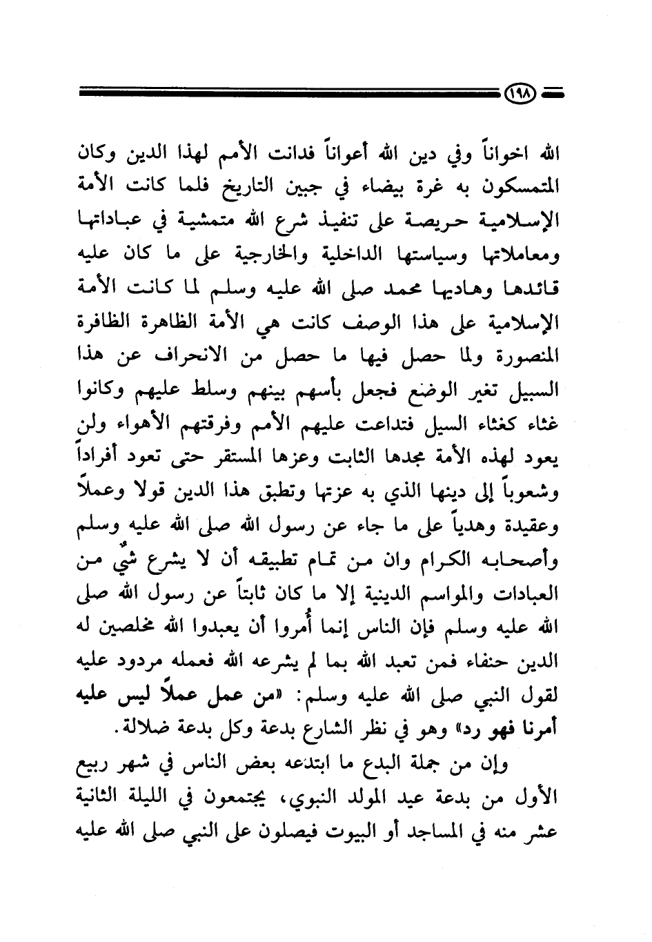 الله إخوانا وفي دين الله أعوانا فدانت الأمم لهذا الدين وكان المتمسكون به غرة بيضاء في جبين التاريخ، فلما كانت الأمة الإسلامية حريصة على تنفيذ شرع الله متمشية في عباداتها ومعاملاتها وسياستها الداخلية والخارجية على ما كان عليه قائدها وهاديها محمد - صَلَّى اللَّهُ عَلَيْهِ وَسَلَّمَ - لما كانت الأمة الإسلامية على هذا الوصف كانت هي الأمة الظاهرة الظافرة المنصورة، ولما حصل فيها ما حصل من الانحراف عن هذا السبيل تغير الوضع فجعل بأسهم بينهم وسلط عليهم، وكانوا غثاء كغثاء السيل فتداعت عليهم الأمم وفرقتهم الأهواء ولن يعود لهذه الأمة مجدها الثابت وعزها المستقر حتى تعود أفرادا وشعوبا إلى دينها الذي به عزتها وتطبق هذا الدين قولا وعملا وعقيدة وهديا على ما جاء عن رسول الله - صَلَّى اللَّهُ عَلَيْهِ وَسَلَّمَ - وأصحابه الكرام، وإن من تمام تطبيقه أن لا يشرع شيء من العبادات والمواسم الدينية إلا ما كان ثابتا عن رسول الله - صَلَّى اللَّهُ عَلَيْهِ وَسَلَّمَ -، فإن الناس إنما أمروا أن يعبدوا الله مخلصين له الدين حنفاء، فمن تعبد الله بما لم يشرعه الله فعمله مردود عليه لقول النبي - صَلَّى اللَّهُ عَلَيْهِ وَسَلَّمَ -: «من عمل عملا ليس عليه أمرنا فهو رد» وهو في نظر الشارع بدعة وكل بدعة ضلالة.