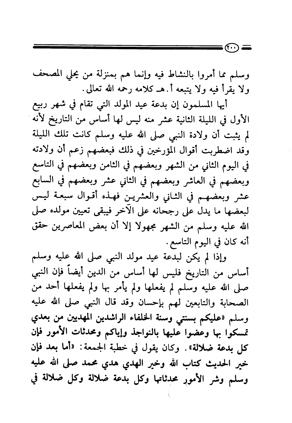 وإذا لم يكن لبدعة عيد مولد النبي - صَلَّى اللَّهُ عَلَيْهِ وَسَلَّمَ - أساس من التاريخ فليس لها أساس من الدين أيضا، فإن النبي - صَلَّى اللَّهُ عَلَيْهِ وَسَلَّمَ - لم يفعلها ولم يأمر بها ولم يفعلها أحد من الصحابة والتابعين لهم بإحسان، وقد قال النبي - صَلَّى اللَّهُ عَلَيْهِ وَسَلَّمَ -: «عليكم بسنتي وسنة الخلفاء الراشدين المهديين من بعدي تمسكوا بها وعضوا عليها بالنواجذ، وإياكم ومحدثات الأمور، فإن كل بدعة ضلالة» . وكان يقول في خطبة الجمعة: «أما بعد، فإن خير الحديث كتاب الله وخير الهدي هدي محمد - صَلَّى اللَّهُ عَلَيْهِ وَسَلَّمَ - وشر الأمور محدثاتها وكل بدعة ضلالة وكل ضلالة في»