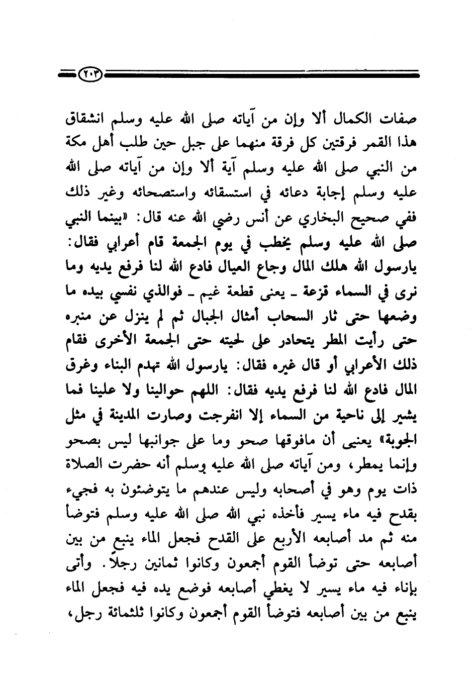 صفات الكمال ألا وإن من آياته - صَلَّى اللَّهُ عَلَيْهِ وَسَلَّمَ - انشقاق هذا القمر فرقتين كل فرقة منهما على جبل حين طلب أهل مكة من النبي - صَلَّى اللَّهُ عَلَيْهِ وَسَلَّمَ - آية، ألا وإن من آياته - صَلَّى اللَّهُ عَلَيْهِ وَسَلَّمَ - إجابة دعائه في استسقائه واستصحائه وغير ذلك، ففي صحيح البخاري عن أنس - رضي الله عنه - قال: «بينما النبي - صَلَّى اللَّهُ عَلَيْهِ وَسَلَّمَ - يخطب في يوم الجمعة قام أعرابي فقال: يا رسول الله، هلك المال وجاع العيال، فادع الله لنا، فرفع يديه، وما نرى في السماء قزعة - يعني قطعة غيم - فوالذي نفسي بيده ما وضعها حتى ثار السحاب أمثال الجبال، ثم لم ينزل عن منبره حتى رأيت المطر يتحادر على لحيته حتى الجمعة الأخرى، فقام ذلك الأعرابي أو قام غيره، فقال: يا رسول الله، تهدم البناء وغرق المال فادع الله لنا فرفع يديه، فقال: اللهم حوالينا ولا علينا، فما يشير إلى ناحية من السماء إلا انفرجت وصارت المدينة في مثل الجوبة» يعني أن ما فوقها صحو وما على جوانبها ليس بصحو وإنما يمطر.