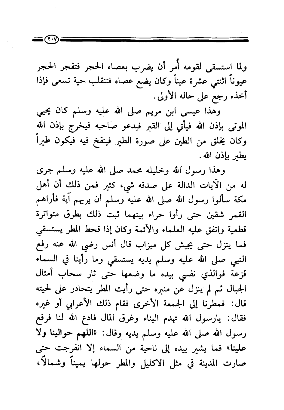 وهذا رسول الله وخليله محمد - صَلَّى اللَّهُ عَلَيْهِ وَسَلَّمَ - جرى له من الآيات الدالة على صدقه شيء كثير، فمن ذلك أن أهل مكة سألوا رسول الله - صَلَّى اللَّهُ عَلَيْهِ وَسَلَّمَ - أن يريهم آية فأراهم القمر شقين حتى رأوا حراء بينهما ثبت ذلك بطرق متواترة قطعية، واتفق عليه العلماء والأئمة وكان إذا قحط المطر يستسقي فما ينزل حتى يجيش كل ميزاب. قال أنس - رضي الله عنه: رفع النبي - صَلَّى اللَّهُ عَلَيْهِ وَسَلَّمَ - يديه يستسقي وما رأينا في السماء قزعة، فوالذي نفسي بيده ما وضعها حتى ثار سحاب أمثال الجبال ثم لم ينزل عن منبره حتى رأيت المطر يتحادر على لحيته. قال: فمطرنا إلى الجمعة الأخرى، فقام ذلك الأعرابي أو غيره فقال: يا رسول الله تهدم البناء وغرق المال فادع الله لنا، فرفع رسول الله - صَلَّى اللَّهُ عَلَيْهِ وَسَلَّمَ - يديه وقال: «اللهم حوالينا ولا علينا» فما يشير بيده إلى ناحية من السماء إلا انفرجت حتى صارت المدينة في مثل الإكليل. والمطر حولها يمينا وشمالا،