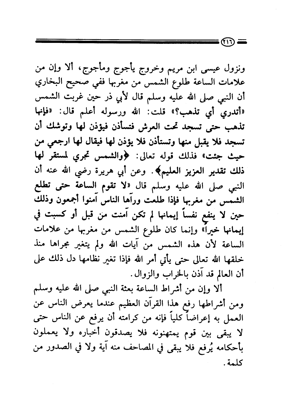 ونزول عيسى ابن مريم وخروج يأجوج ومأجوج، ألا وإن من علامات الساعة طلوع الشمس من مغربها، ففي صحيح البخاري أن النبي - صَلَّى اللَّهُ عَلَيْهِ وَسَلَّمَ - قال لأبي ذر حين غربت الشمس: «"أتدري أين تذهب؟ " قلت: الله ورسوله أعلم. قال: "فإنها تذهب حتى تسجد تحت العرش فتستأذن فيؤذن لها، وتوشك أن تسجد فلا يقبل منها وتستأذن فلا يؤذن لها فيقال لها ارجعي من حيث جئت» . فذلك قوله تعالى: {وَالشَّمْسُ تَجْرِي لِمُسْتَقَرٍّ لَهَا ذَلِكَ تَقْدِيرُ الْعَزِيزِ الْعَلِيمِ} . وعن أبي هريرة - رضي الله عنه - أن النبي - صَلَّى اللَّهُ عَلَيْهِ وَسَلَّمَ - قال: «" لا تقوم الساعة حتى تطلع الشمس من مغربها فإذا طلعت ورآها الناس آمنوا أجمعون، وذلك حين لا ينفع نفسا إيمانها لم تكن آمنت من قبل أو كسبت في إيمانها خيرا» .