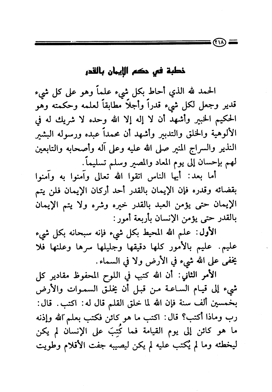 الحمد لله الذي أحاط بكل شيء علما وهو على كل شيء قدير وجعل لكل شيء قدرا وأجلا مطابقا لعلمه وحكمته وهو الحكيم الخبير، وأشهد أن لا إله إلا الله وحده لا شريك له في الألوهية والخلق والتدبير، وأشهد أن محمدا عبده ورسوله البشير النذير والسراج المنير، صلى الله عليه وعلى آله وأصحابه والتابعين لهم بإحسان إلى يوم المعاد والمصير وسلم تسليما.