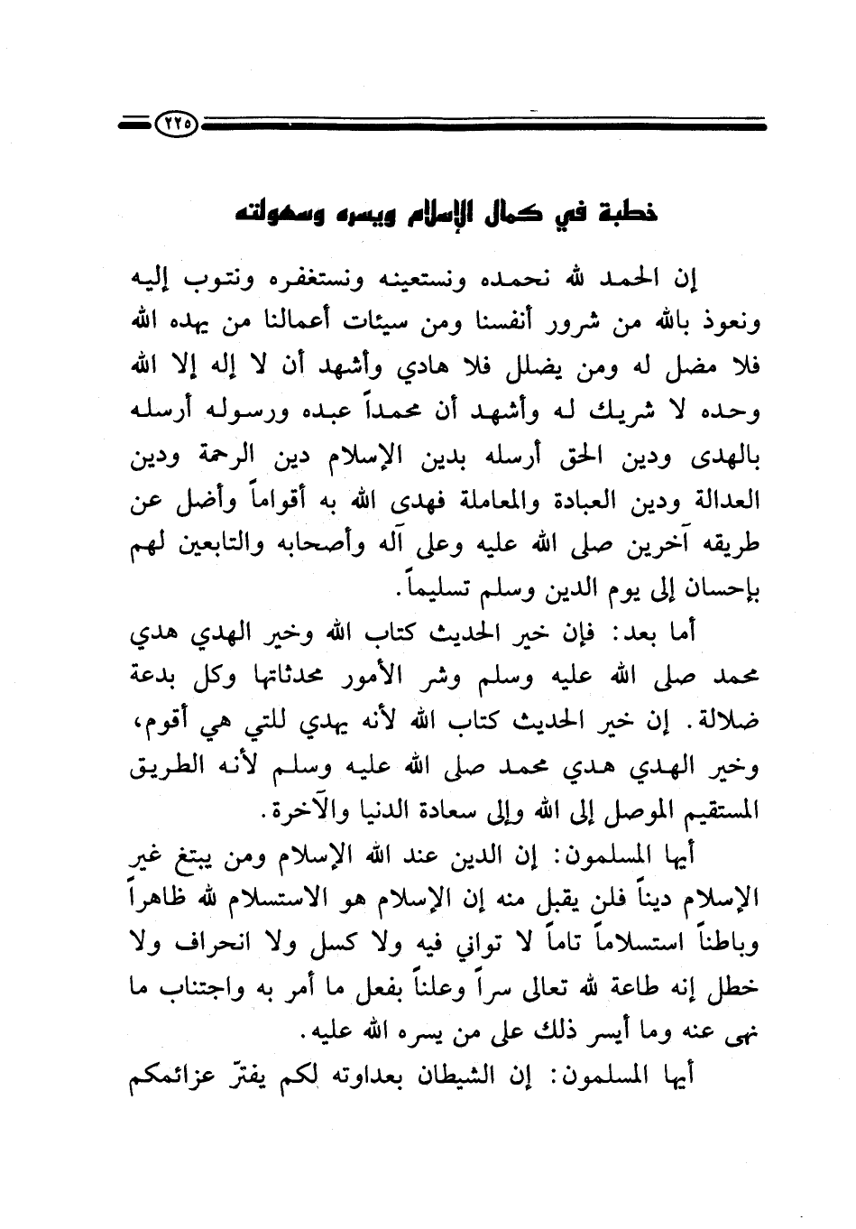 أيها المسلمون: إن الدين عند الله الإسلام ومن يبتغ غير الإسلام دينا فلن يقبل منه، إن الإسلام هو الاستسلام لله ظاهرا وباطنا استسلاما تاما لا تواني فيه ولا كسل ولا انحراف ولا خطل، إنه طاعة لله تعالى سرا وعلنا بفعل ما أمر به واجتناب ما نهى عنه وما أيسر ذلك على من يسره الله عليه.