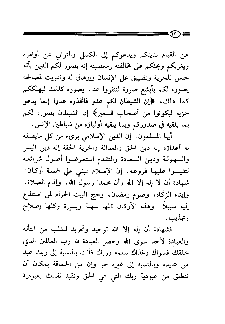 أيها المسلمون: إن الدين الإسلامي بريء من كل ما يصفه به أعداؤه إنه دين الحق والعدالة والحرية الحقة إنه دين اليسر والسهولة ودين السعادة والتقدم، استعرضوا أصول شرائعه لتقيسوا عليها فروعه. إن الإسلام مبني على خمسة أركان: شهادة أن لا إله إلا الله وأن محمدا رسول الله، وإقام الصلاة، وإيتاء الزكاة، وصوم رمضان، وحج البيت الحرام لمن استطاع إليه سبيلا. وهذه الأركان كلها سهلة ويسيرة وكلها إصلاح وتهذيب.
