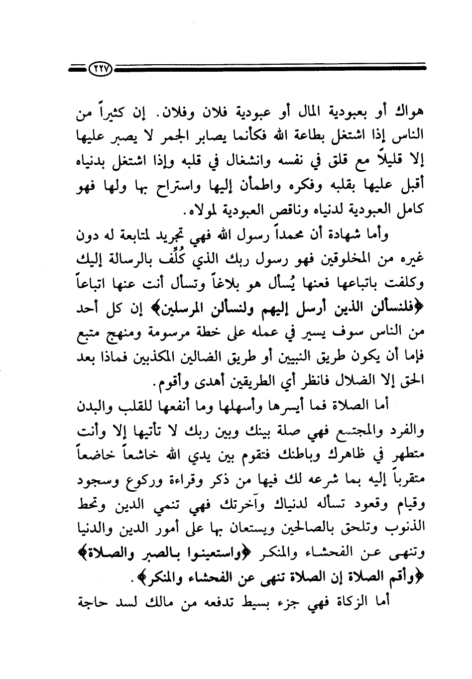 أما الصلاة فما أيسرها وأسهلها وما أنفعها للقلب والبدن والفرد والمجتمع، فهي صلة بينك وبين ربك لا تأتيها إلا وأنت متطهر في ظاهرك وباطنك، فتقوم بين يدي الله خاشعا خاضعا متقربا إليه بما شرعه لك فيها من ذكر وقراءة وركوع وسجود وقيام وقعود تسأله لدنياك وآخرتك، فهي تنمي الدين وتحط الذنوب وتلحق بالصالحين ويستعان بها على أمور الدين والدنيا وتنهى عن الفحشاء والمنكر {وَاسْتَعِينُوا بِالصَّبْرِ وَالصَّلَاةِ} ، {وَأَقِمِ الصَّلَاةَ إِنَّ الصَّلَاةَ تَنْهَى عَنِ الْفَحْشَاءِ وَالْمُنْكَرِ} .