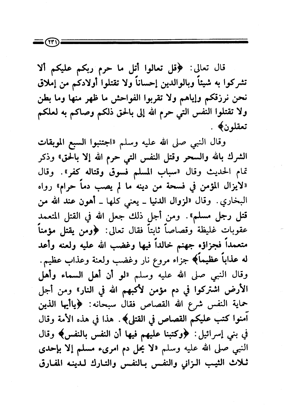 قال تعالى: {قُلْ تَعَالَوْا أَتْلُ مَا حَرَّمَ رَبُّكُمْ عَلَيْكُمْ أَلَّا تُشْرِكُوا بِهِ شَيْئًا وَبِالْوَالِدَيْنِ إِحْسَانًا وَلَا تَقْتُلُوا أَوْلَادَكُمْ مِنْ إِمْلَاقٍ نَحْنُ نَرْزُقُكُمْ وَإِيَّاهُمْ وَلَا تَقْرَبُوا الْفَوَاحِشَ مَا ظَهَرَ مِنْهَا وَمَا بَطَنَ وَلَا تَقْتُلُوا النَّفْسَ الَّتِي حَرَّمَ اللَّهُ إِلَّا بِالْحَقِّ ذَلِكُمْ وَصَّاكُمْ بِهِ لَعَلَّكُمْ تَعْقِلُونَ} .