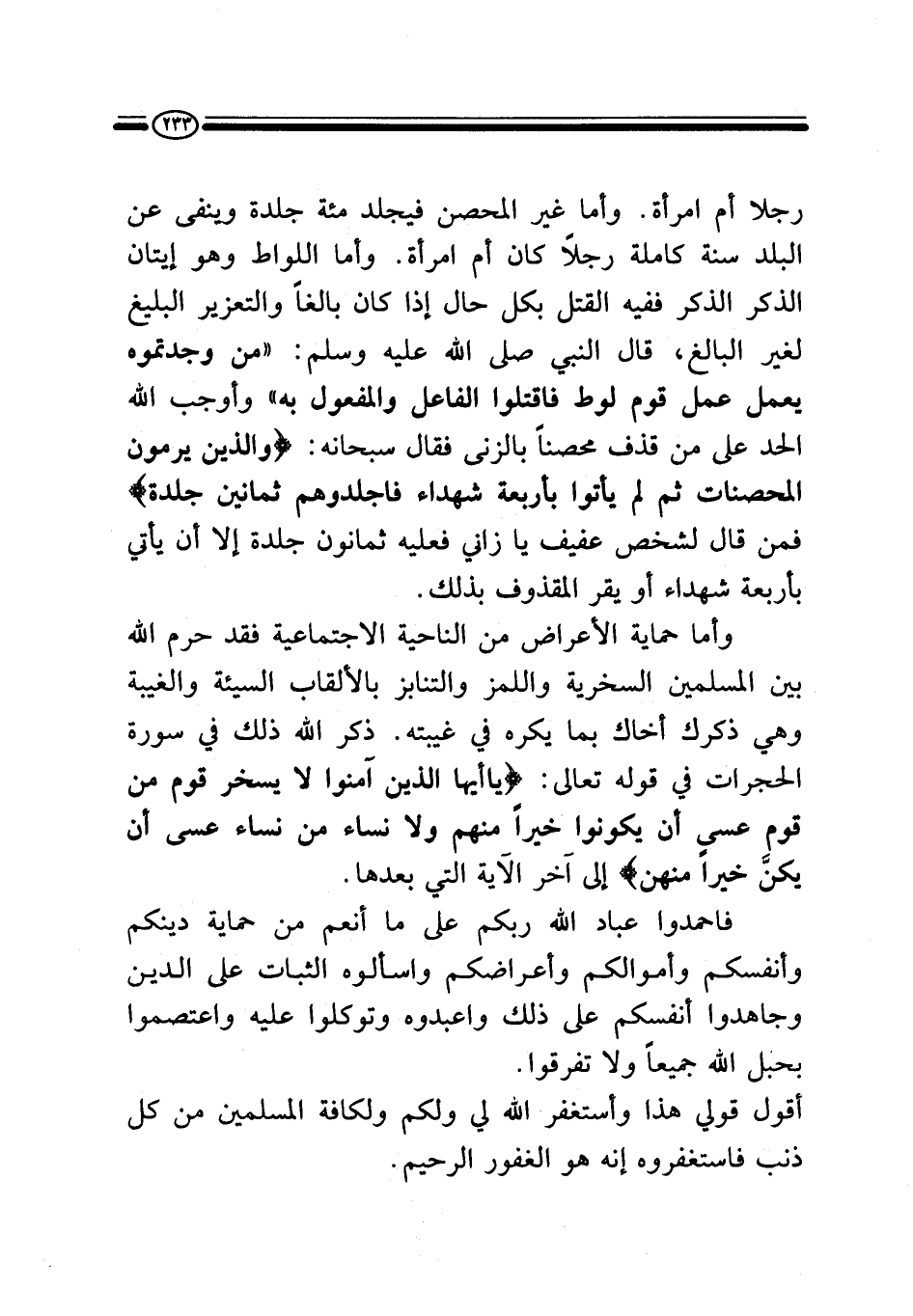 رجلا أم امرأة. وأما غير المحصن فيجلد مئة جلدة وينفى عن البلد سنة كاملة رجلا كان أم امرأة. وأما اللواط وهو إتيان الذكر الذكر ففيه القتل بكل حال إذا كان بالغا والتعزير البليغ لغير البالغ، قال النبي - صَلَّى اللَّهُ عَلَيْهِ وَسَلَّمَ -: «"من وجدتموه يعمل عمل قوم لوط فاقتلوا الفاعل والمفعول به» . وأوجب الله الحد على من قذف محصنا بالزنى فقال سبحانه: {وَالَّذِينَ يَرْمُونَ الْمُحْصَنَاتِ ثُمَّ لَمْ يَأْتُوا بِأَرْبَعَةِ شُهَدَاءَ فَاجْلِدُوهُمْ ثَمَانِينَ جَلْدَةً} ، فمن قال لشخص عفيف: يا زاني فعليه ثمانون جلدة إلا أن يأتي بأربعة شهداء أو يقر المقذوف بذلك.