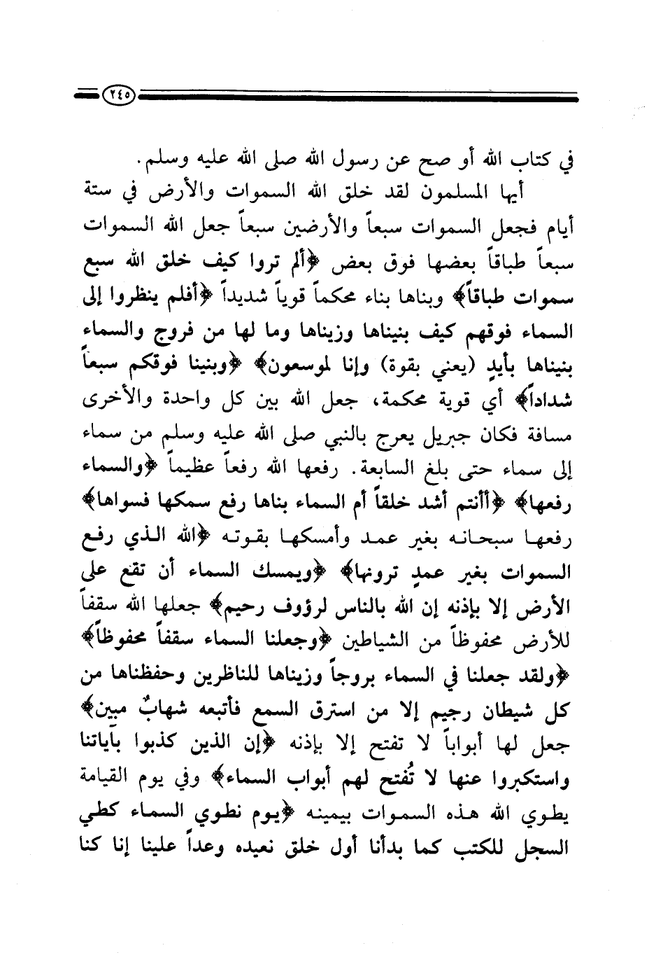 أيها المسلمون لقد خلق الله السماوات والأرض في ستة أيام فجعل السماوات سبعا والأرضين سبعا، جعل الله السماوات سبعا طباقا بعضها فوق بعض {أَلَمْ تَرَوْا كَيْفَ خَلَقَ اللَّهُ سَبْعَ سَمَاوَاتٍ طِبَاقًا} ، وبناها بناء محكما قويا شديدا {أَفَلَمْ يَنْظُرُوا إِلَى السَّمَاءِ فَوْقَهُمْ كَيْفَ بَنَيْنَاهَا وَزَيَّنَّاهَا وَمَا لَهَا مِنْ فُرُوجٍ} ، {والسماء بنيناها بأيد} (يعني بقوة) {وَإِنَّا لَمُوسِعُونَ} ، {وَبَنَيْنَا فَوْقَكُمْ سَبْعًا شِدَادًا} أي قوية محكمة، جعل الله بين كل واحدة والأخرى مسافة، فكان جبريل يعرج بالنبي - صَلَّى اللَّهُ عَلَيْهِ وَسَلَّمَ - من سماء إلى سماء حتى بلغ السابعة.