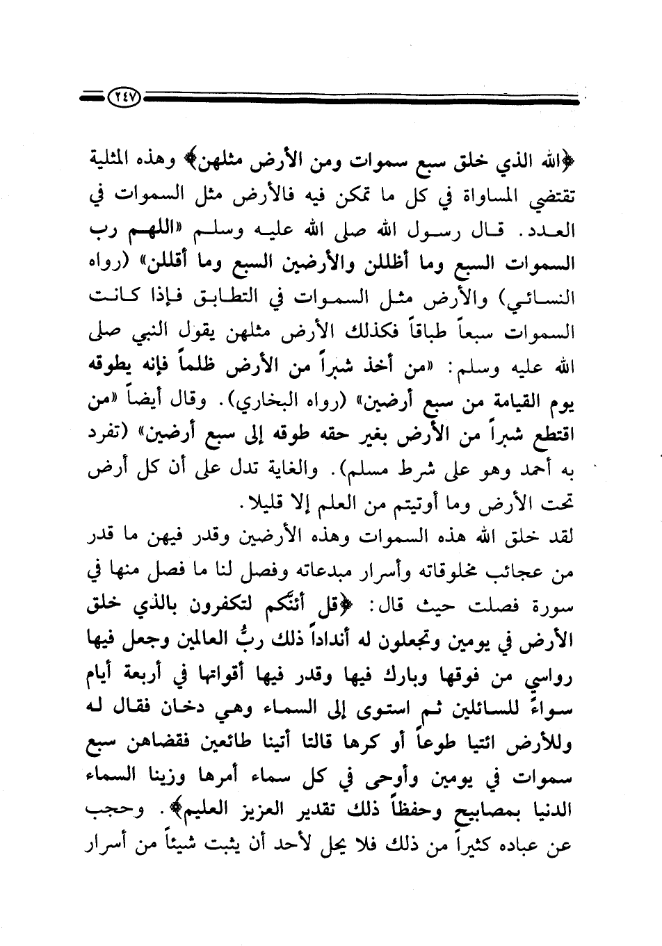 {اللَّهُ الَّذِي خَلَقَ سَبْعَ سَمَاوَاتٍ وَمِنَ الْأَرْضِ مِثْلَهُنَّ} ، وهذه المثلية تقتضي المساواة في كل ما تمكن فيه، فالأرض مثل السماوات في العدد. قال رسول الله - صَلَّى اللَّهُ عَلَيْهِ وَسَلَّمَ -: «"اللهم رب السماوات السبع وما أظللن والأرضين السبع وما أقللن» (رواه النسائي) ، والأرض مثل السماوات في التطابق، فإذا كانت السماوات سبعا طباقا فكذلك الأرض مثلهن، يقول النبي - صَلَّى اللَّهُ عَلَيْهِ وَسَلَّمَ -: «"من أخذ شبرا من الأرض ظلما فإنه يطوقه يوم القيامة من سبع أرضين» (رواه البخاري) . وقال أيضا: «"من اقتطع شبرا من الأرض بغير حقه طوقه إلى سبع أرضين» (تفرد به أحمد وهو على شرط مسلم) . والغاية تدل على أن كل أرض تحت الأرض وما أوتيتم من العلم إلا قليلا.