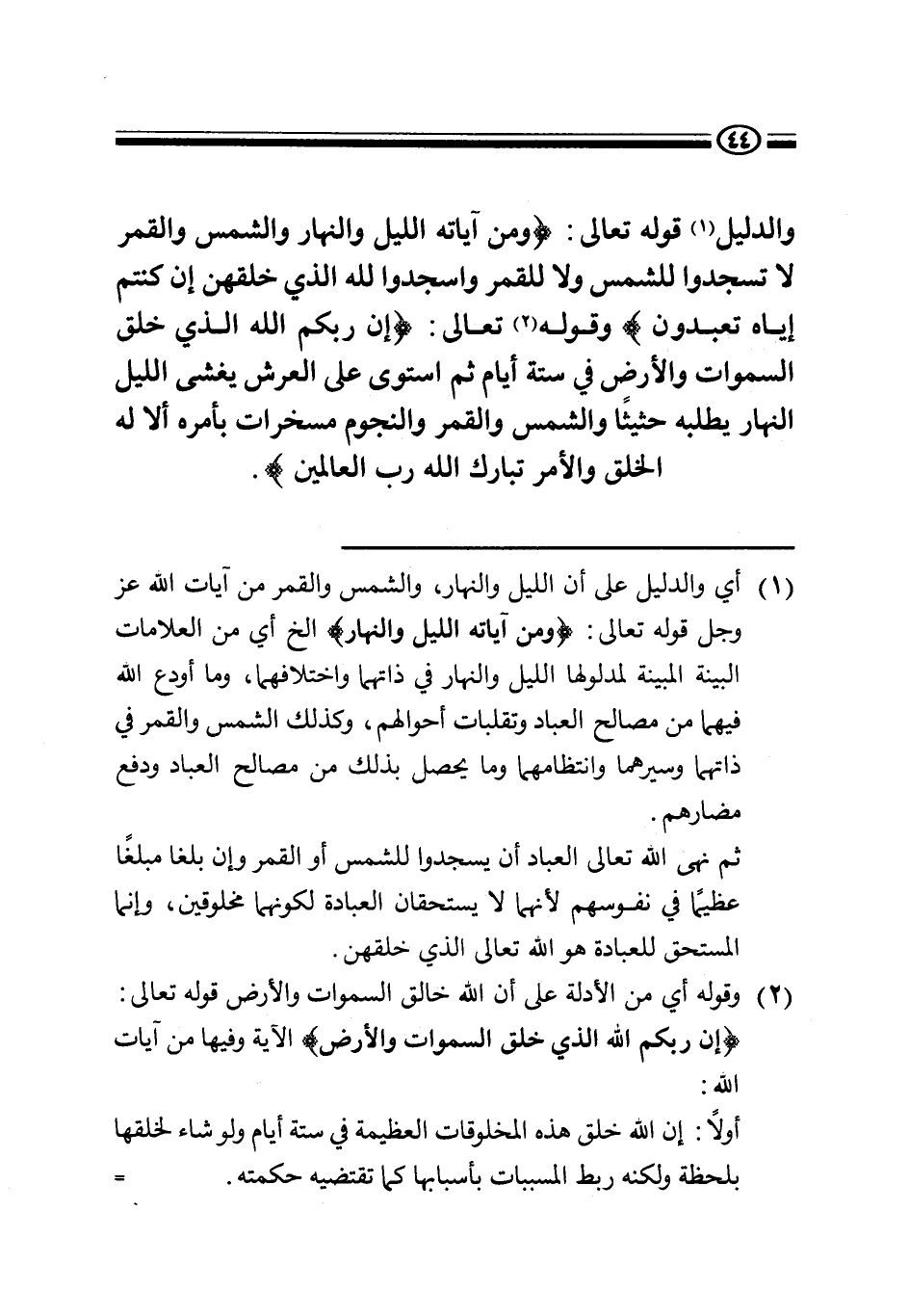 (1) أي والدليل على أن الليل والنهار، والشمس والقمر من آيات الله عز وجل قوله تعالى: {وَمِنْ آيَاتِهِ اللَّيْلُ وَالنَّهَارُ} . . . . إلخ أي من العلامات البينة المبينة لمدلولها الليل والنهار في ذاتهما واختلافهما، وما أودع الله فيهما من مصالح العباد وتقلبات أحوالهم، وكذلك الشمس والقمر في ذاتهما وسيرهما وانتظامهما وما يحصل بذلك من مصالح العباد ودفع مضارهم.