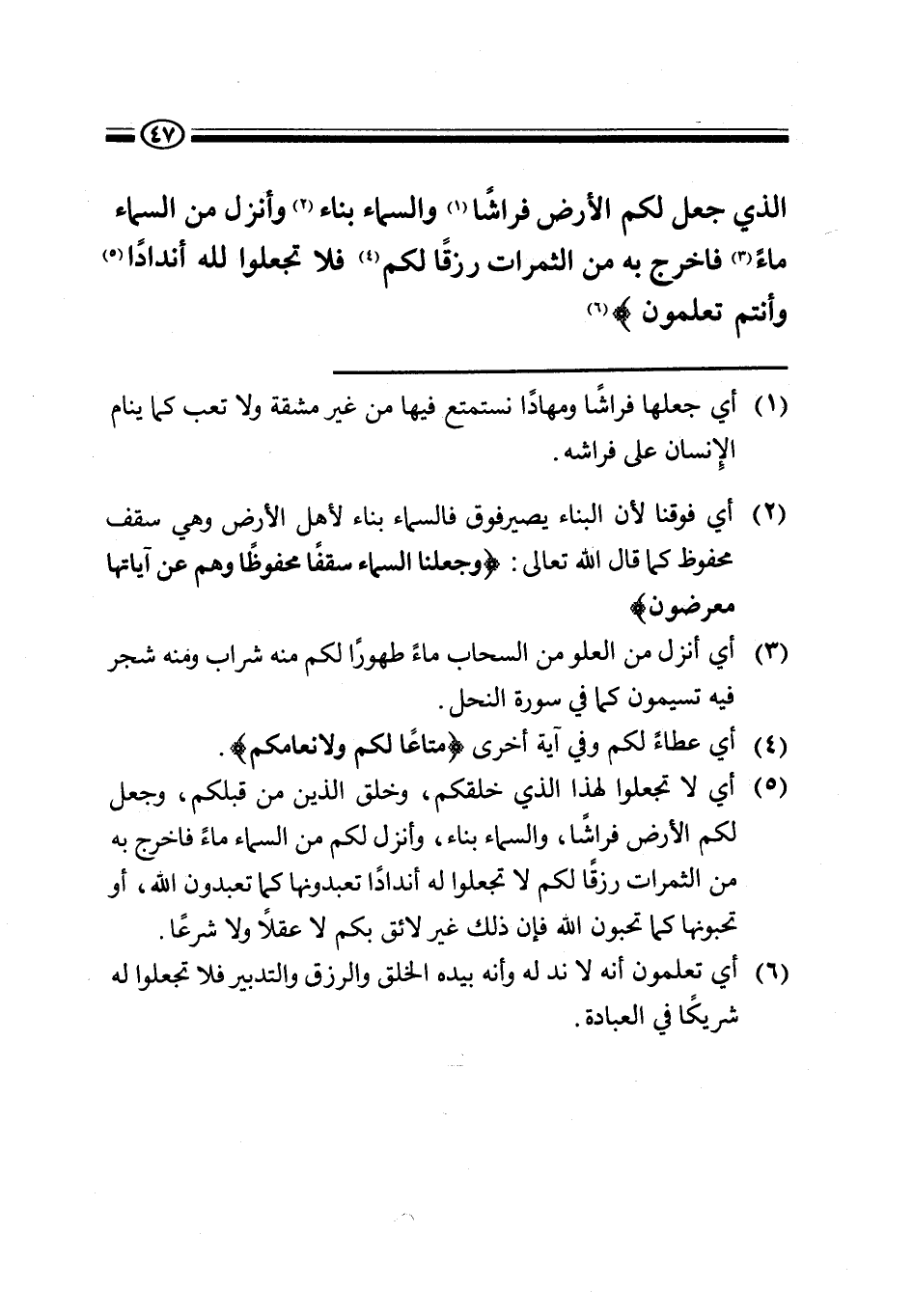 {الَّذِي جَعَلَ لَكُمُ الْأَرْضَ فِرَاشًا} (1) {وَالسَّمَاءَ بِنَاءً} (2) {وَأَنْزَلَ مِنَ السَّمَاءِ مَاءً} (3) {فَأَخْرَجَ بِهِ مِنَ الثَّمَرَاتِ رِزْقًا لَكُمْ} (4) {فَلَا تَجْعَلُوا لِلَّهِ أَنْدَادًا} (5) {وَأَنْتُمْ تَعْلَمُونَ} (6) .