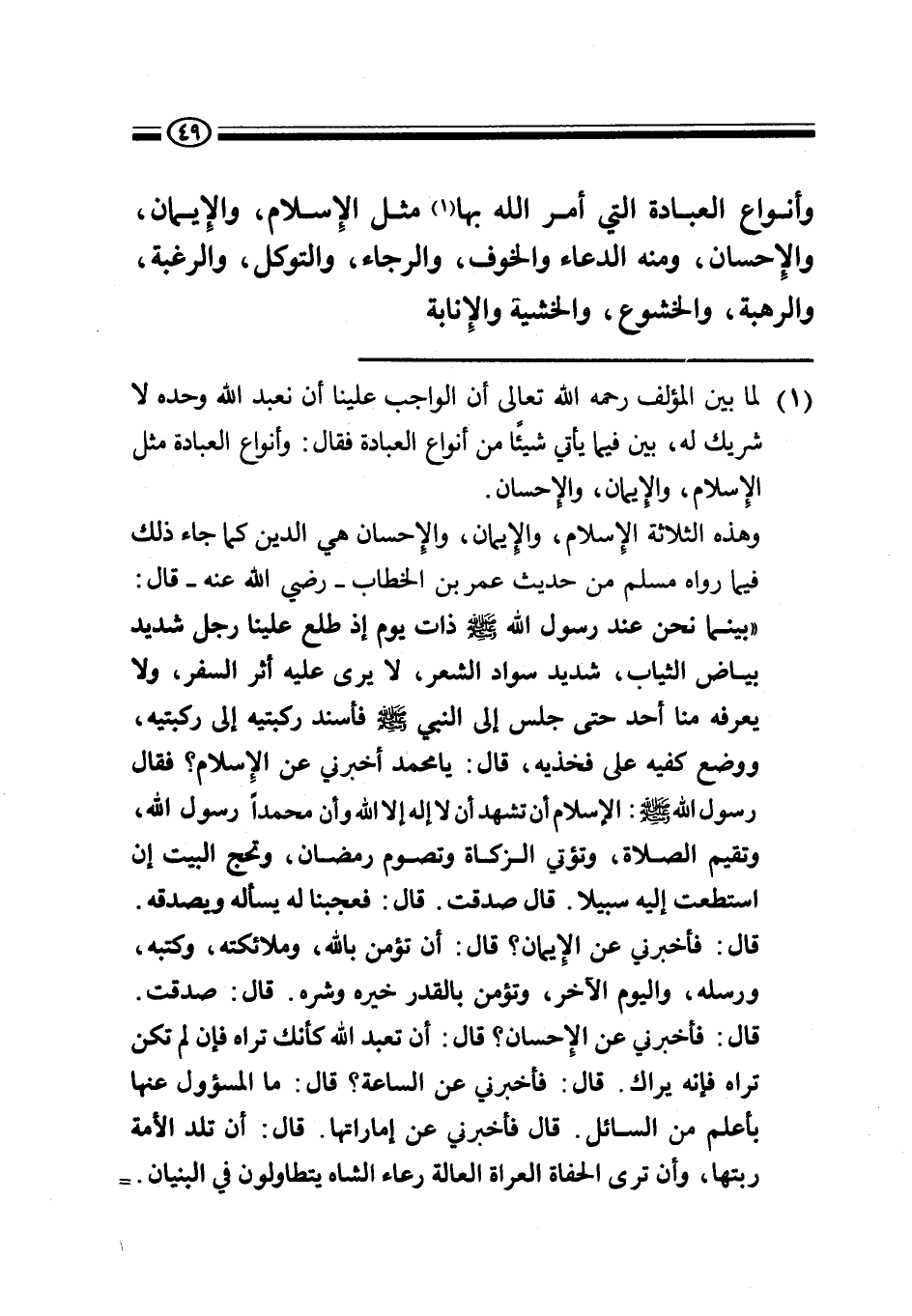 وهذه الثلاثة الإسلام، والإيمان، والإحسان هي الدين كما جاء ذلك فيما رواه مسلم من حديث عمر بن الخطاب -رضي الله عنه- قال: «بينما نحن عند رسول الله صَلَّى اللَّهُ عَلَيْهِ وَسَلَّمَ ذات يوم إذ طلع علينا رجل شديد بياض الثياب شديد سواد الشعر، لا يرى عليه أثر السفر، ولا يعرفه منا أحد حتى جلس إلى النبي صَلَّى اللَّهُ عَلَيْهِ وَسَلَّمَ فأسند ركبتيه إلى ركبتيه، ووضع كفيه على فخديه، قال: يا محمد أخبرني عن الإسلام؟ فقال رسول الله صَلَّى اللَّهُ عَلَيْهِ وَسَلَّمَ: الإسلام أن تشهد أن لا إله إلا الله وأن محمدا رسول الله، وتقيم الصلاة وتؤتي الزكاة، وتصوم رمضان، وتحج البيت إن استطعت إليه سبيلا. قال: صدقت. قال: فعجبنا له يسأله ويصدقه. قال: فأخبرني عن الإيمان؟ قال: أن تؤمن بالله، وملائكته وكتبه ورسله، واليوم الآخر، وتؤمن بالقدر خيره وشره. قال: صدقت. قال: فأخبرني عن الإحسان؟ قال: أن تعبد الله كأنك تراه فإن لم تكن تراه فإنه يراك. قال: فأخبرني عن الساعة؟ قال: ما المسئول عنها بأعلم من السائل. قال: فأخبرني عن أماراتها؟ قال: أن تلد الأمة ربتها، وأن ترى الحفاة العراة العالة رعاء الشاء يتطاولون في البنيان،»
