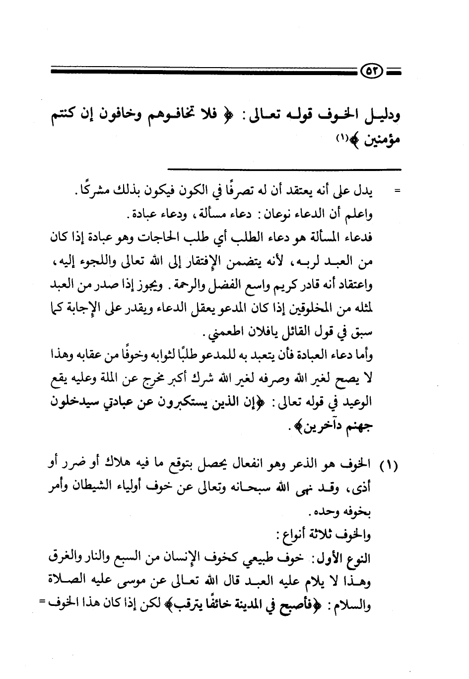 (1) الخوف هو الذعر، وهو انفعال يحصل بتوقع ما فيه هلاك أو ضرر أو أذى، وقد نهى الله سبحانه وتعالى عن خوف أولياء الشيطان وأمر بخوفه وحده.