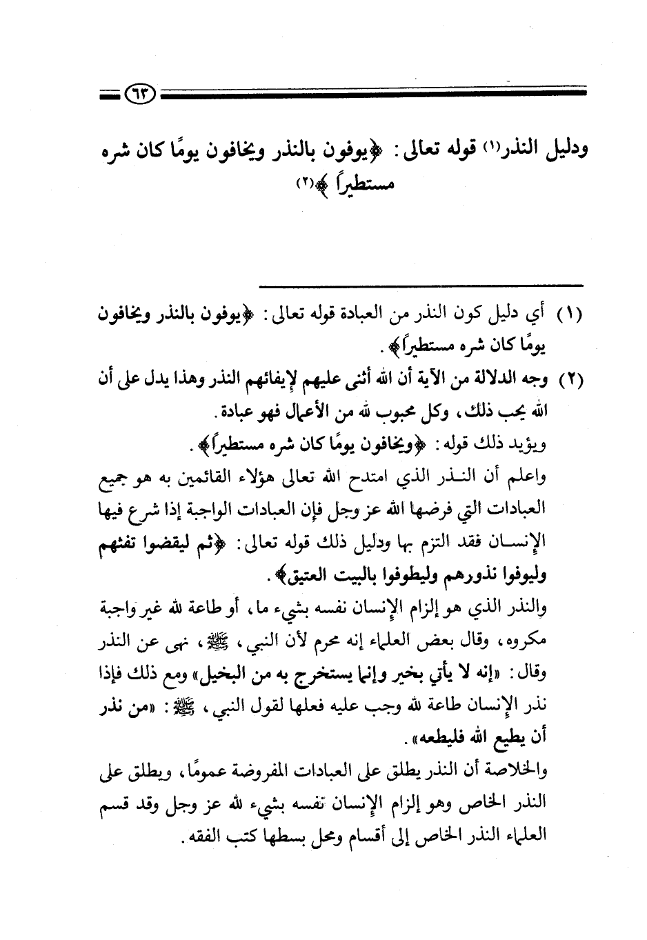 ودليل النذر (1) قوله تعالى: {يُوفُونَ بِالنَّذْرِ وَيَخَافُونَ يَوْمًا كَانَ شَرُّهُ مُسْتَطِيرًا} (1)