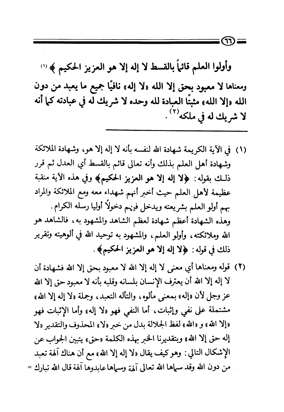 (1) في الآية الكريمة شهادة الله لنفسه بأنه لا إله إلا هو، وشهادة الملائكة وشهادة أهل العلم بذلك، وأنه تعالى قائم بالقسط أي العدل، ثم قرر ذلك بقوله: {لَا إِلَهَ إِلَّا هُوَ الْعَزِيزُ الْحَكِيمُ} وفي هذه الآية منقبة عظيمة لأهل العلم حيث أخبر أنهم شهداء معه ومع الملائكة والمراد بهم أولو العلم بشريعته ويدخل فيهم دخولا أوليا رسله الكرام. وهذه الشهادة أعظم شهادة لعظم الشاهد والمشهود به، فالشاهد هو الله وملائكته، وأولو العلم، والمشهود به توحيد الله في ألوهيته وتقرير ذلك في قوله: {لَا إِلَهَ إِلَّا هُوَ الْعَزِيزُ الْحَكِيمُ} .